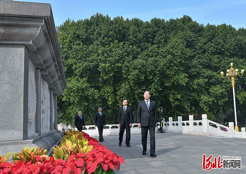 王东峰迈步上前,整理花篮缎带。接着,王东峰、许勤、叶冬松、廉毅敏等领导同志缓步绕行,瞻仰华北军区烈士纪念碑。