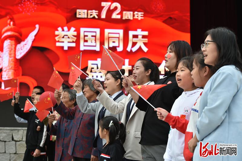 10月1日,阜平县骆驼湾村骆驼湾大戏台前,村民和游客一同唱响《我和我的祖国》,一面面五星红旗飘扬在骆驼湾村。河北日报记者赵海江摄