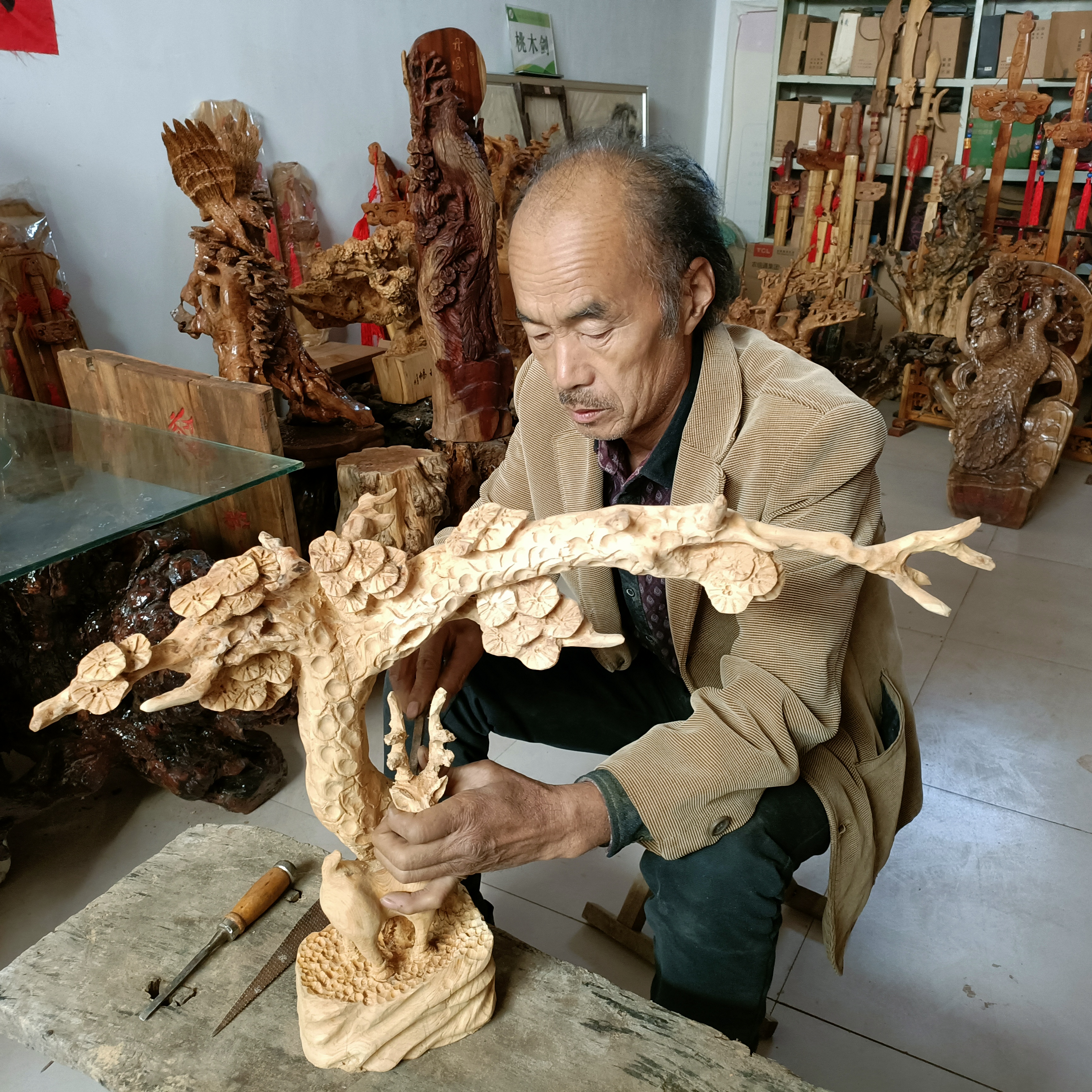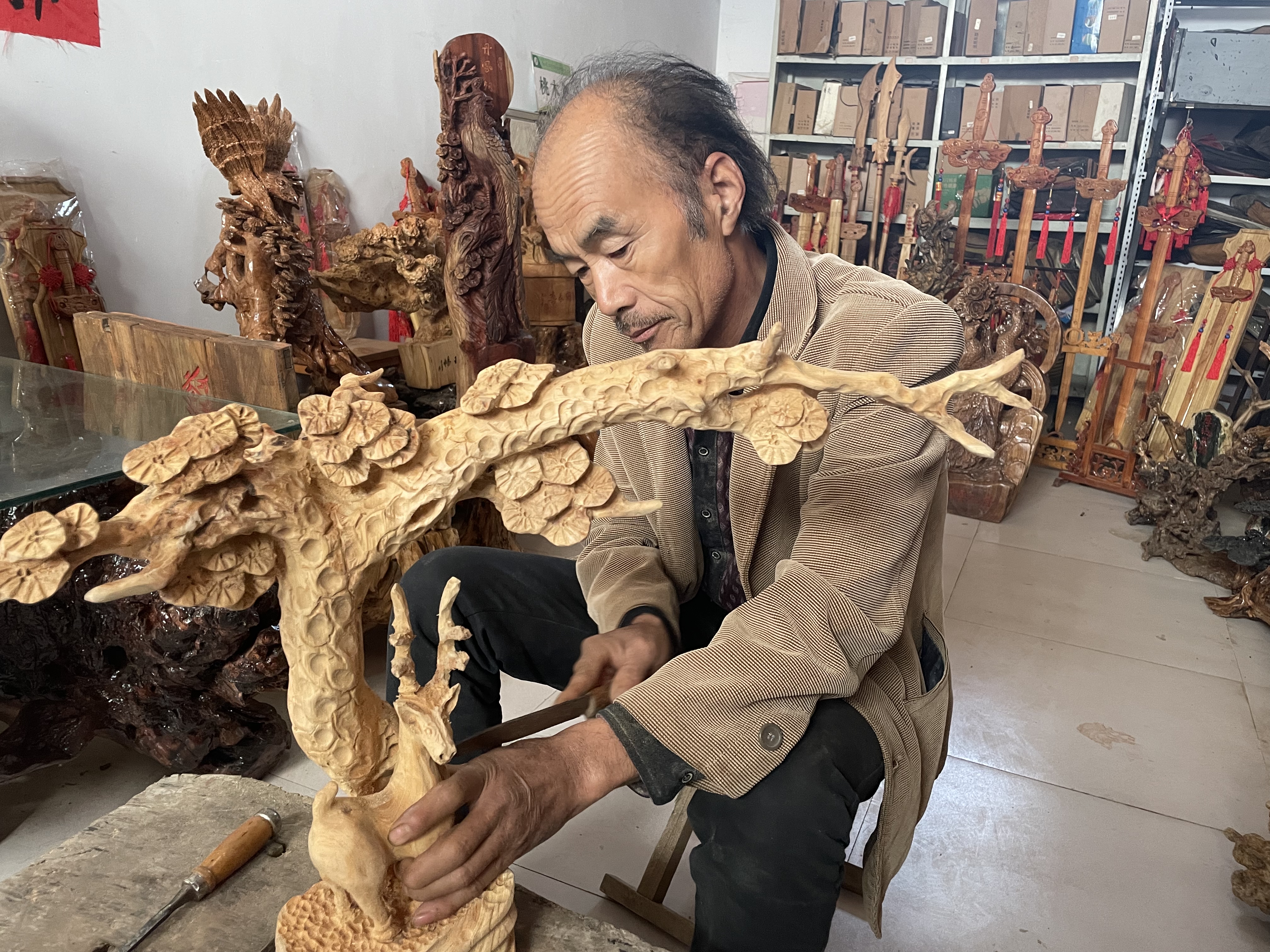 目前,张国印已经完成根雕作品1000余件,涵盖人物花鸟、山水风景等。张国印还将制作根雕的技艺传授给学生和村民,希望把根雕技艺传承下去。