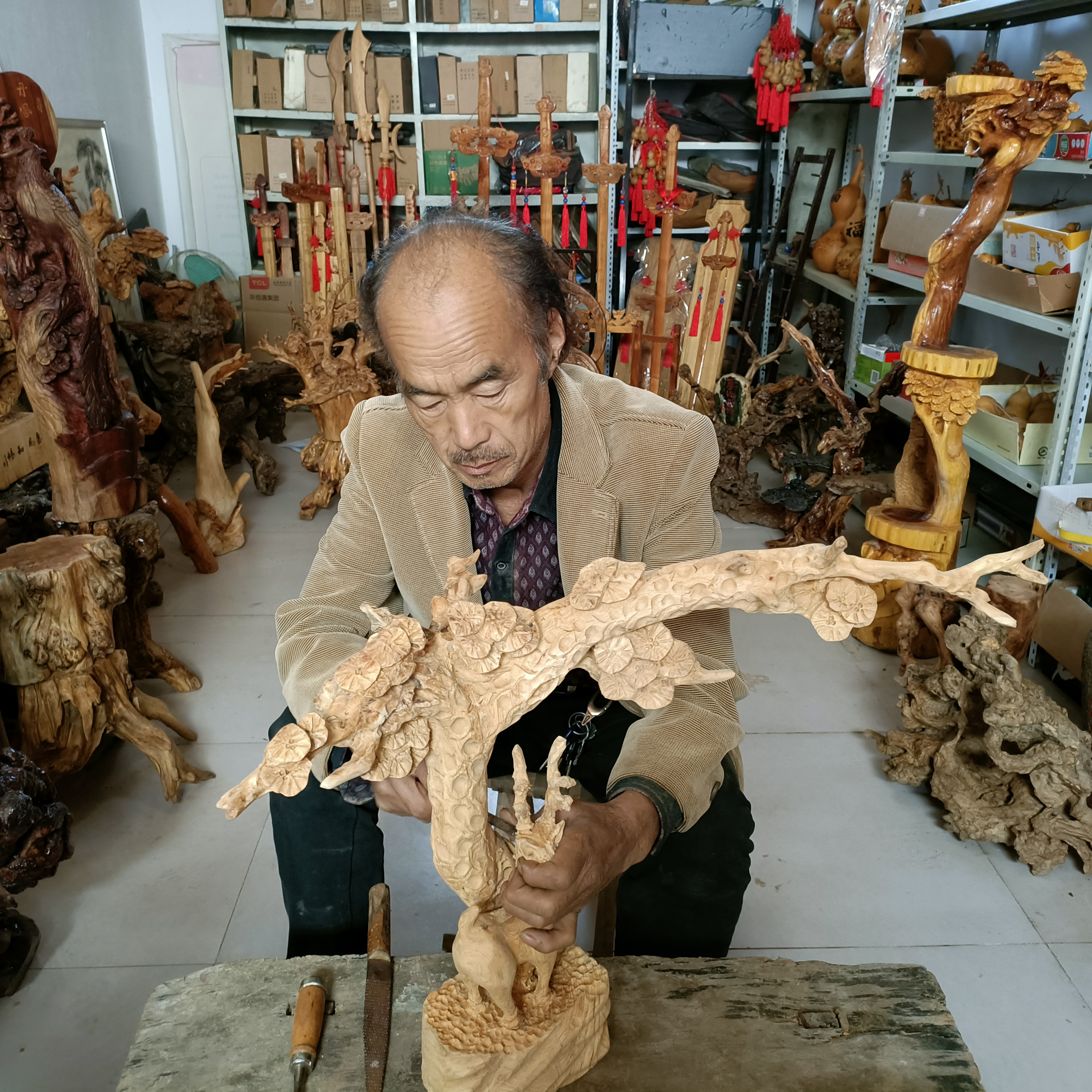 “南宫、宁晋、内丘等地,都有我的熟客。”张国印说,自己还有一位来自河南的“粉丝”,“我们经在网上交流,他也在学习制作根雕技艺,看我做直播,还曾专门过来学习。”