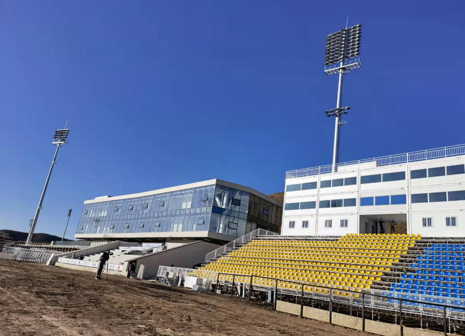 “这里的临时设施要比国家跳台滑雪中心和国家冬季两项中心都要多,有13000平方米的临时设施,观众席座椅后面搭建的三层房屋为临时设施,上面两层为OBS评论席,有41间,房子最上面有栏杆的地方是摄像机位,还有解说席。”李振龙告诉记者。