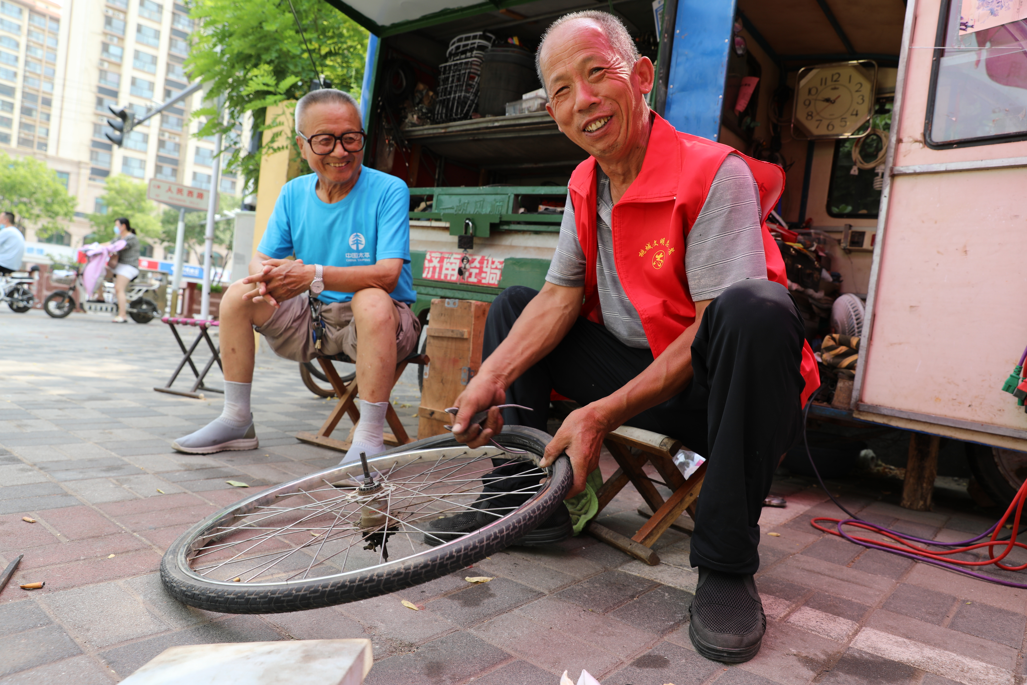 在人民路康宁街口,志愿者免费为市民修理自行车。
