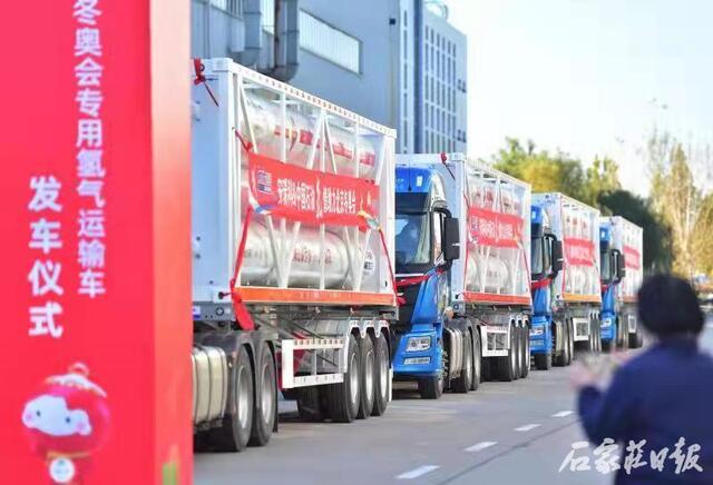 11月11日,石家庄安瑞科气体机械有限公司院内,数台“身披”红色条幅、为北京冬奥会和冬残奥会火炬提供燃料的氢气管束式集装箱车鸣笛发车,驶往奥运赛场,为赛事举办提供氢能保障。此举也将石市的氢能装备发展成果推向了国际交流的平台。