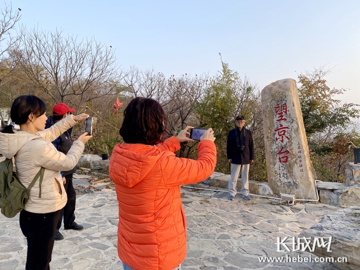 来自京津冀的游客在三界碑徒步驿站——望京台驻足留念。长城网·冀云客户端记者 信贺宁 摄