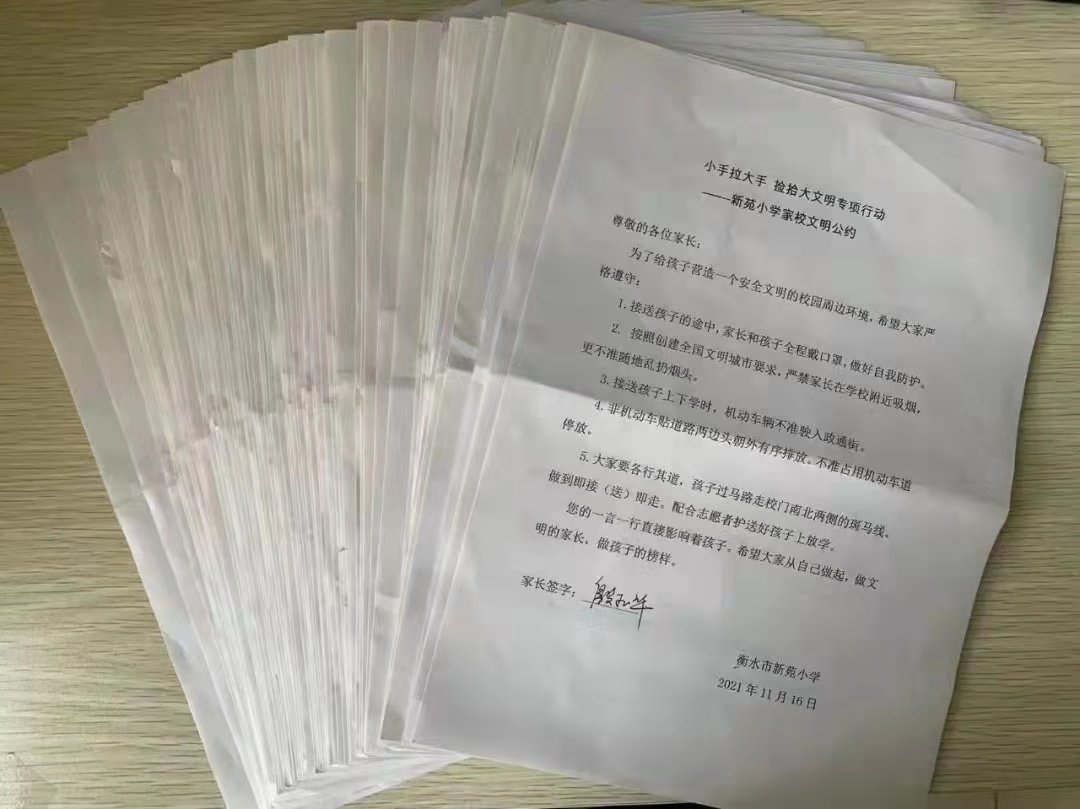 学生与家长签订《控烟卫生文明志愿者承诺书》,家长签订《小手拉大手 捡拾大文明专项行动文明公约》……近日一股家校文明之风在新苑小学流行开来。