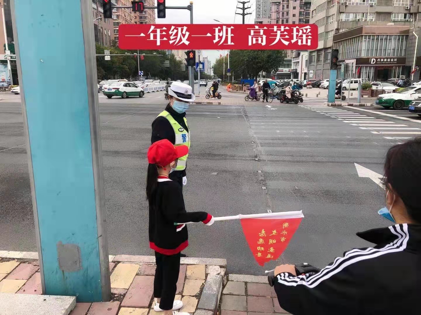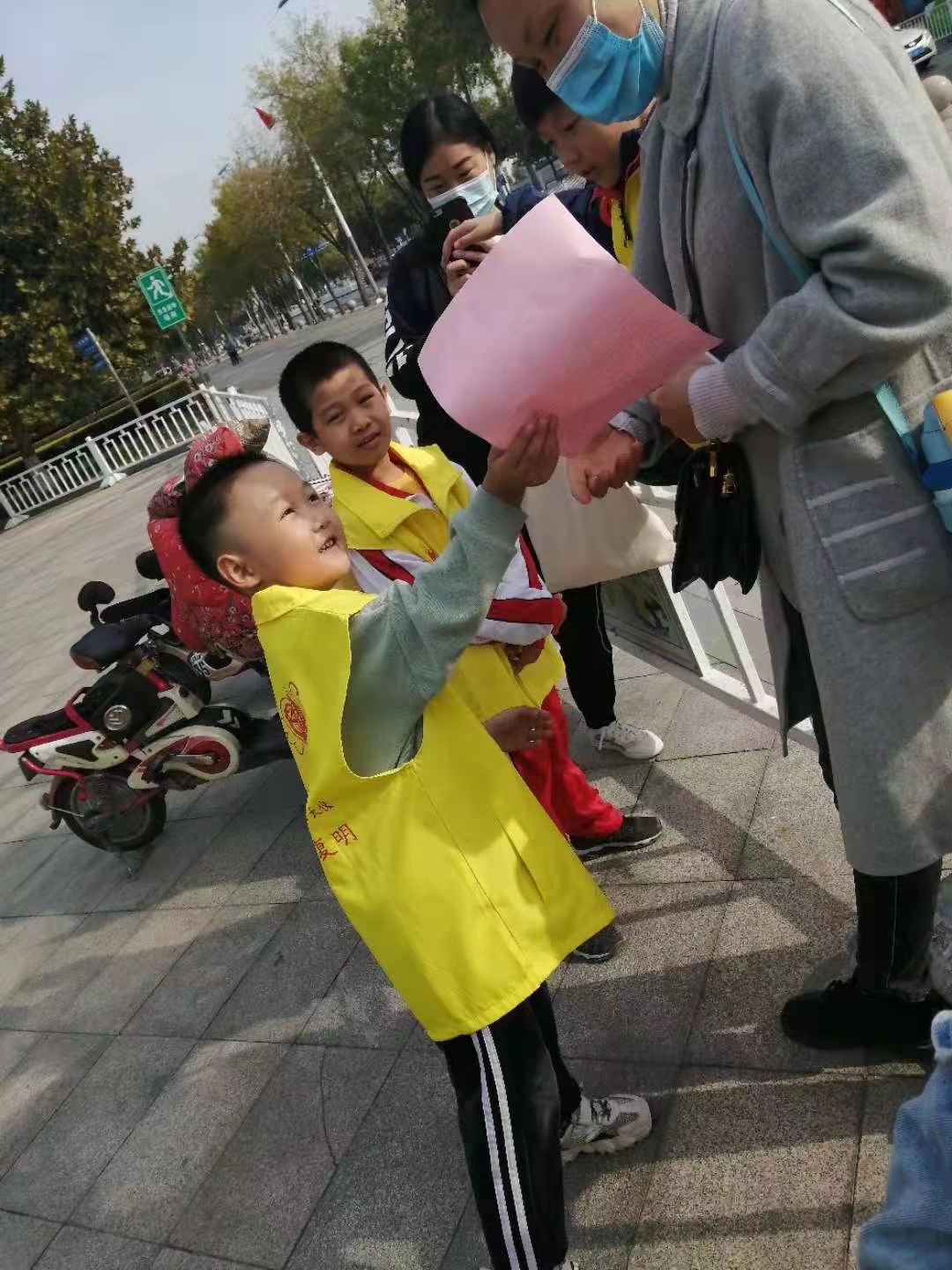 在新苑小学,每天上学和放学时段,穿着红马甲的学生志愿者成为校门口最温情的风景。他们举着写有“禁止吸烟”“保护环境 严禁乱扔烟头”等标语的牌子,站在门口提醒着来往的家长。