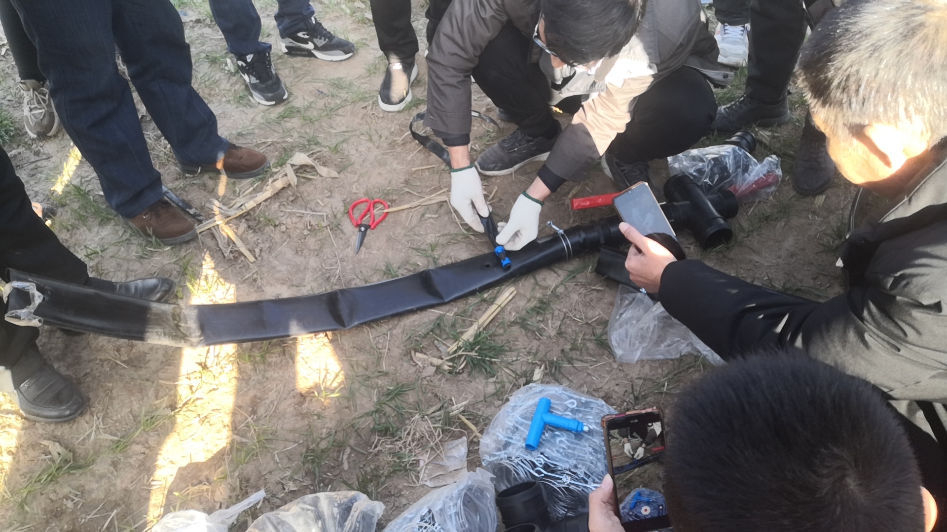 这是武邑县供销社组织举办的滴灌技术指导现场会,省市供销社领导以及各县种植大户、农业技术人员参加了活动。今年6月份以来,省供销社为认真贯彻习近平生态文明思想,落实党中央国务院和省委省政府关于地下水超采综合治理和粮食安全保障的决策部署,推进农业社会化服务规模化经营,联合省农业农村厅、省气象局、河北农业大学、河北农科院、省农发行等单位,共同推进以浅埋滴灌为突破口的土地全程托管服务。经过近半年的努力,省供销社发挥系统联合优势,积极争取各级党委政府的支持,联合省农业农村厅、省农科院、河北农大等单位,成立了协调推进组、专家顾问组和物资采购组,全力推进各项工作开展。截至目前,全省已签约土地面积近30万亩,涉及10个市47个县。武邑县供销社作为其中之一,积极贯彻落实省、市供销社安排部署,以浅埋滴灌节水农业为突破口,大力推进全链条土地托管服务,通过和土地托管(流转)公司及种植大户的沟通交流,确定以土地托管(流转)工作为依托,由河北省现代农业服务公司出资,委托县供销社代理与清凉店镇河北隆大庄园畜牧股份有限公司和紫塔乡武邑聚鑫种植农民专业合作社开展浅埋滴灌节水农业项目,采取“省农服公司+县供销社+新型农业经营主体”联合的运营模式,实现土地全托管1200亩。目前,种植的小麦长势良好,为解决浅埋滴灌铺管和使用中遇到的问题,促进农业增产、增收,武邑县供销社邀请4名省专家到场,把培训场地设在了田间地头,现场解答滴灌种植中遇到的问题,让种植大户们听得懂、看得见、学得会。