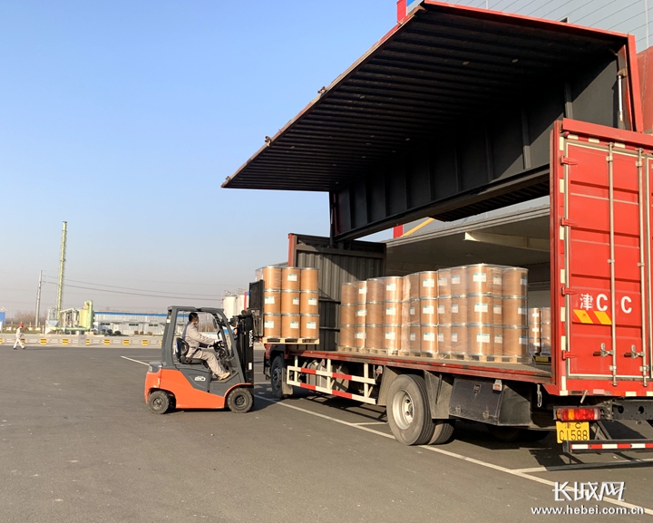 物料接收区广场前,咖啡因原料药正在装车。长城网·冀云客户端记者 李丽钧 摄