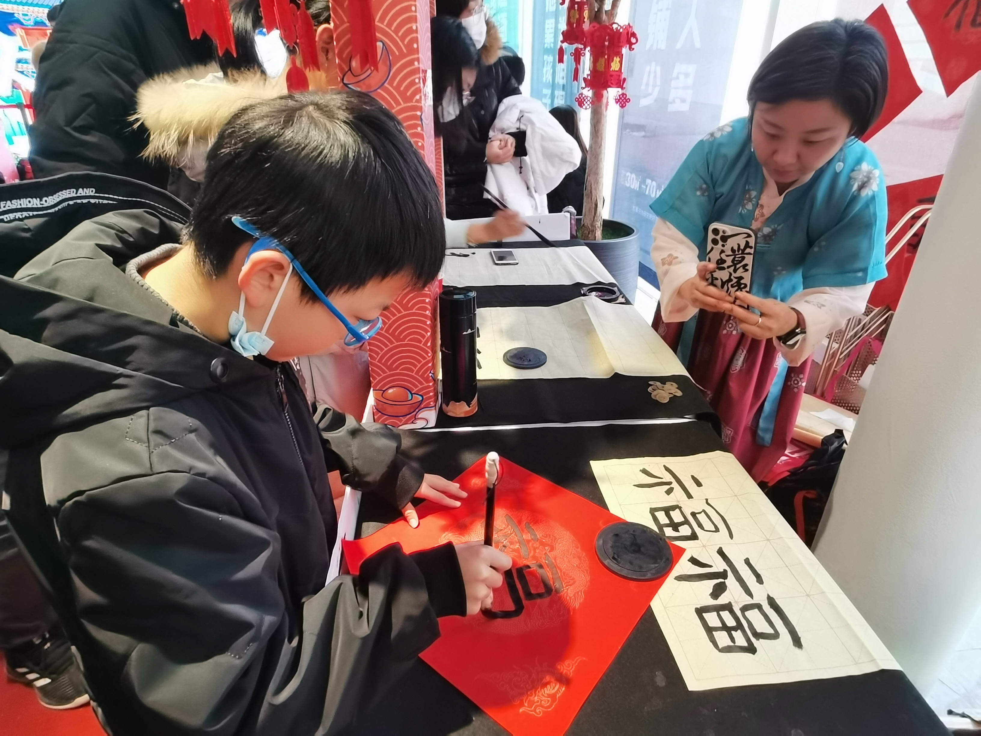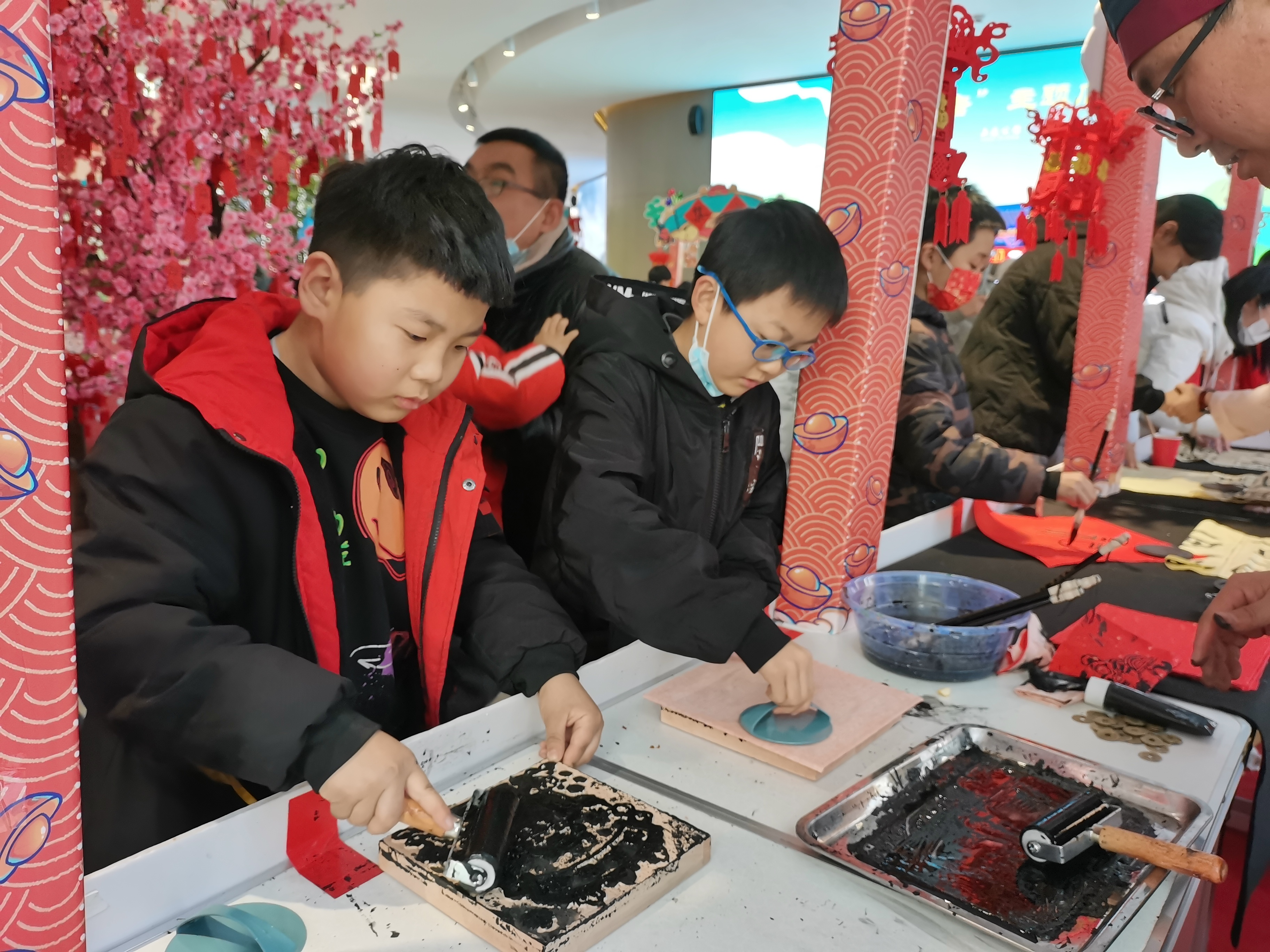 投壶、悬挂许愿卡、描摹不同字体的福字、体验木版年画制作……在彩色盒子美术中心,一场国潮庙会趣味横生,孩子们在学习民俗的同时,也充分感受到了浓浓的“年味儿”。