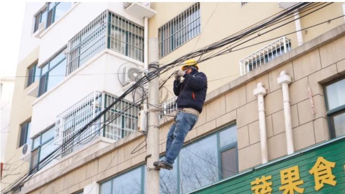 整治现场,10余名专业施工人员明确责任、合理分工,把凌乱分布的外墙线路一根根理顺、捆扎、重新固定。自2021年11月30日至12月24日,全县共整治“空中飞线”98处,梳理、捆绑、清理线缆1400余米。