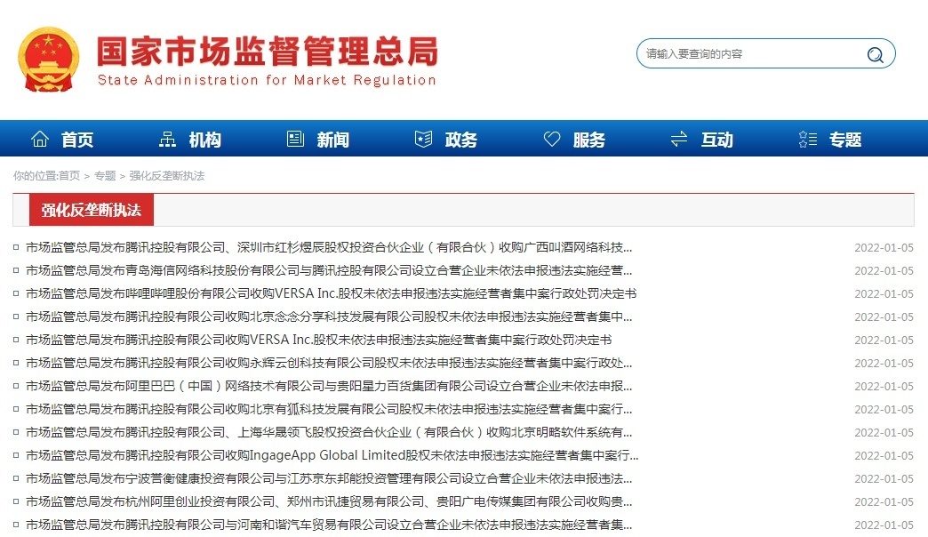 1月5日,市场监管总局网站公布一批行政处罚案件,涉及腾讯、哔哩哔哩、阿里巴巴等企业。其中,2021年12月31日,市场监管总局对腾讯控股有限公司与河南和谐汽车贸易有限公司设立合营企业未依法申报违法实施经营者集中案作出行政处罚决定。根据相关规定,基于调查情况和评估结论,该机关决定分别给予腾讯、和谐汽车50万元罚款的行政处罚。