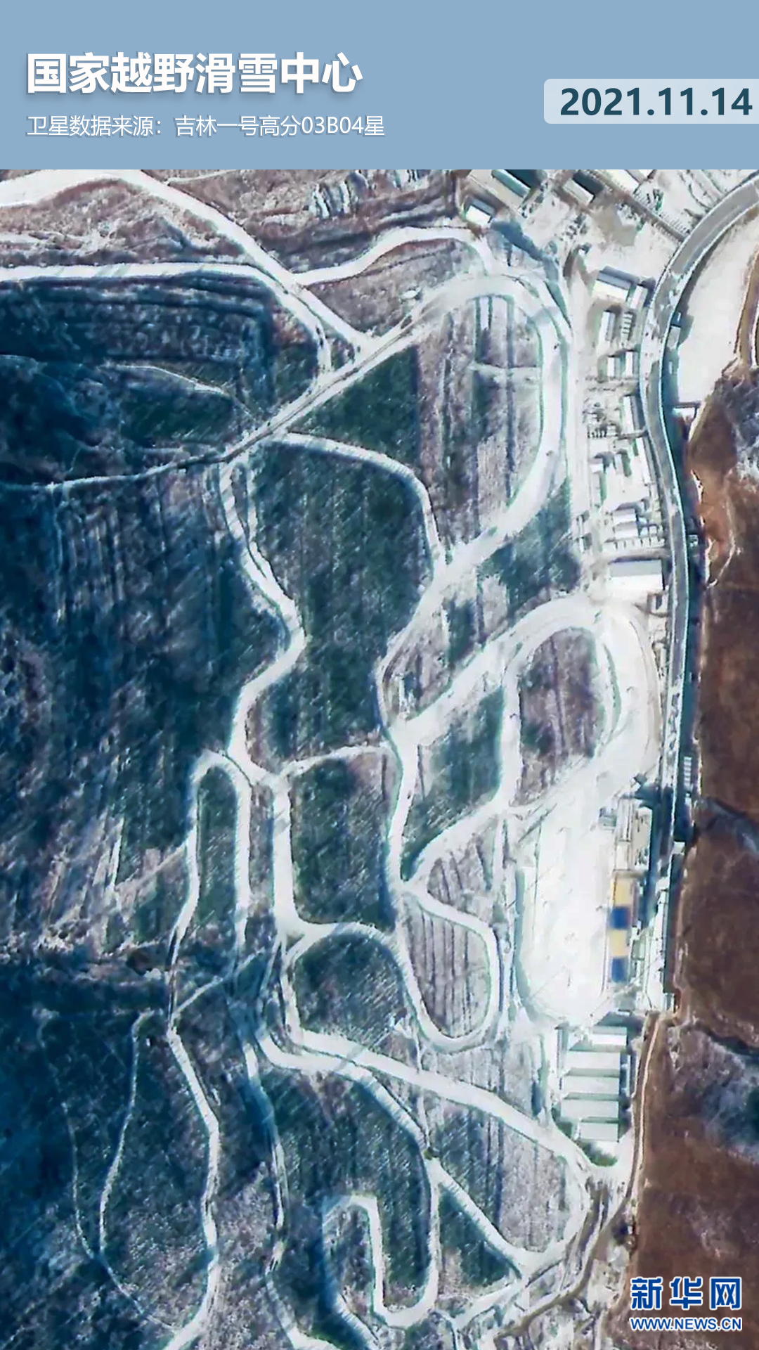 ▲2021年11月15日,造雪机在张家口赛区国家越野滑雪中心进行造雪作业(无人机照片)。新华社发(武殿森摄)