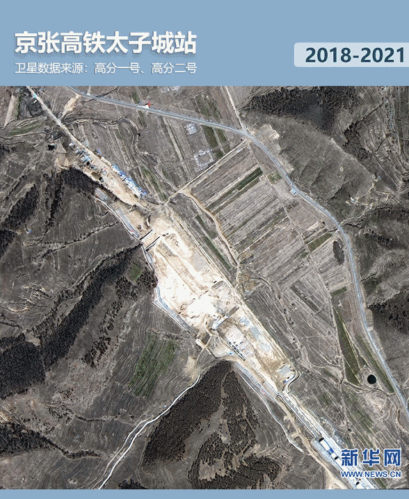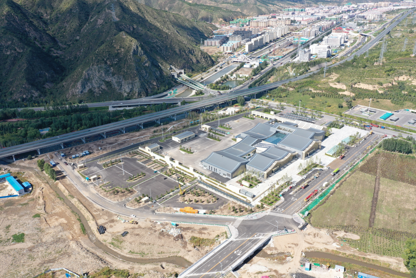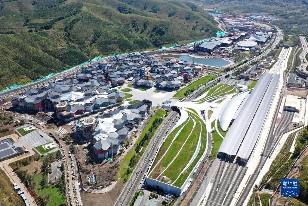 ▲位于太子城冰雪小镇的冬奥颁奖广场(左)、太子城高铁站客运枢纽和太子城高铁站(2021年9月10日摄,无人机照片)。新华社发(武殿森 摄)
