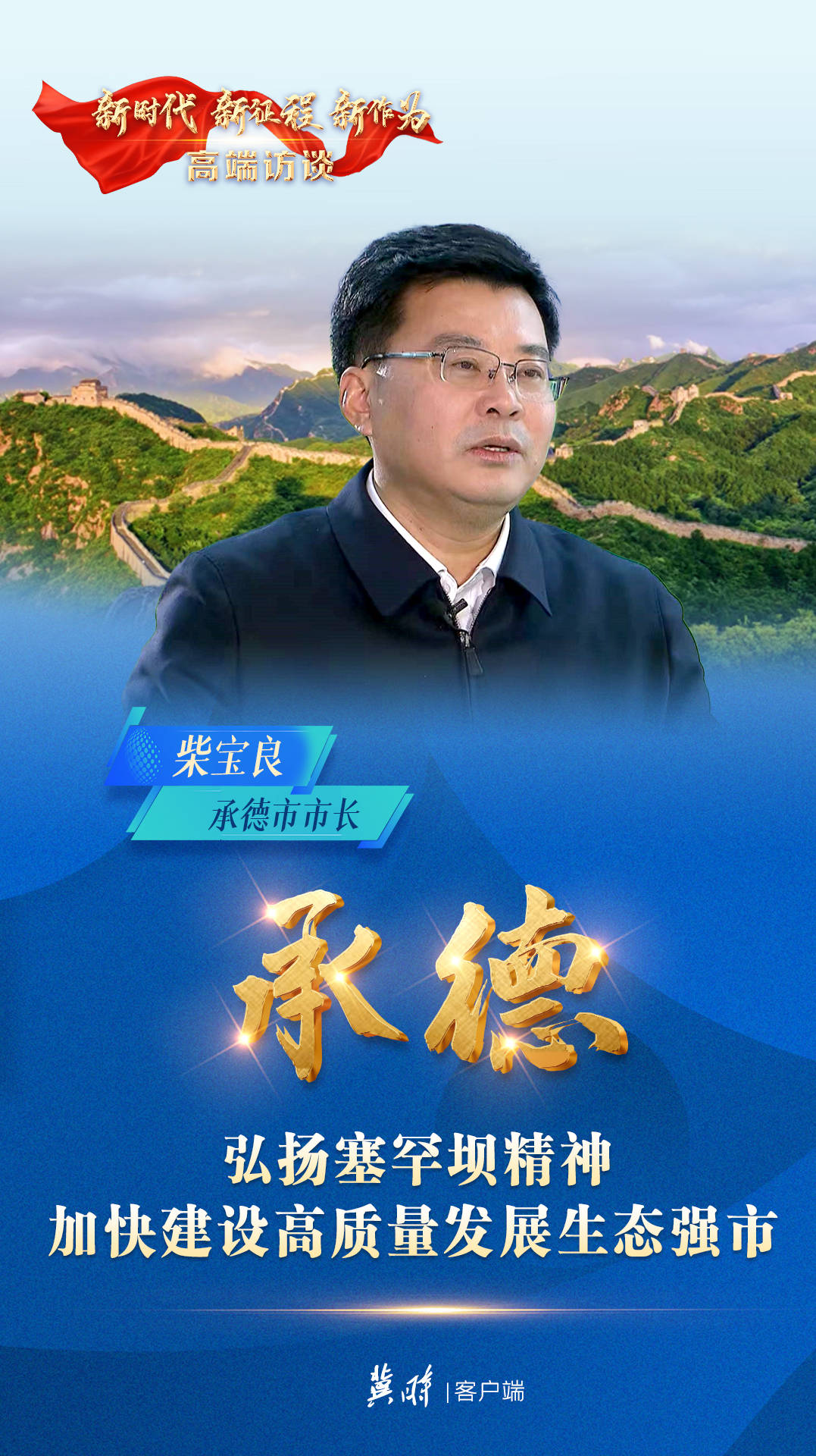 深入学习贯彻习近平总书记在承德考察时的重要讲话和党的十九届六中全会精神,落实省第十次党代会提出的目标任务,承德市立足自身定位,以塞罕坝精神为引领,推动各项工作对标对表,干在实处,走在前列,积蓄高质量发展新动能。大型全媒体系列报道《新时代 新征程 新作为·高端访谈》。