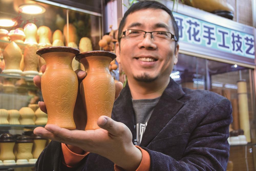图为刘建春展示葫芦砑花手工技艺。 记者 赵亮 摄
