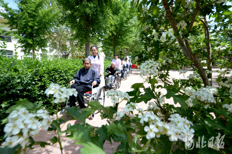 秦皇岛市抚宁区特困人口供养中心工作人员推着行动不便的老人在庭院赏花。河北日报记者杜柏桦摄