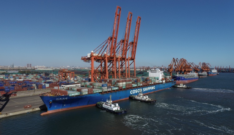 一艘轮船在拖轮的协助下向唐山港京唐港区集装箱码头靠泊(资料片)。 新华社记者朱旭东摄