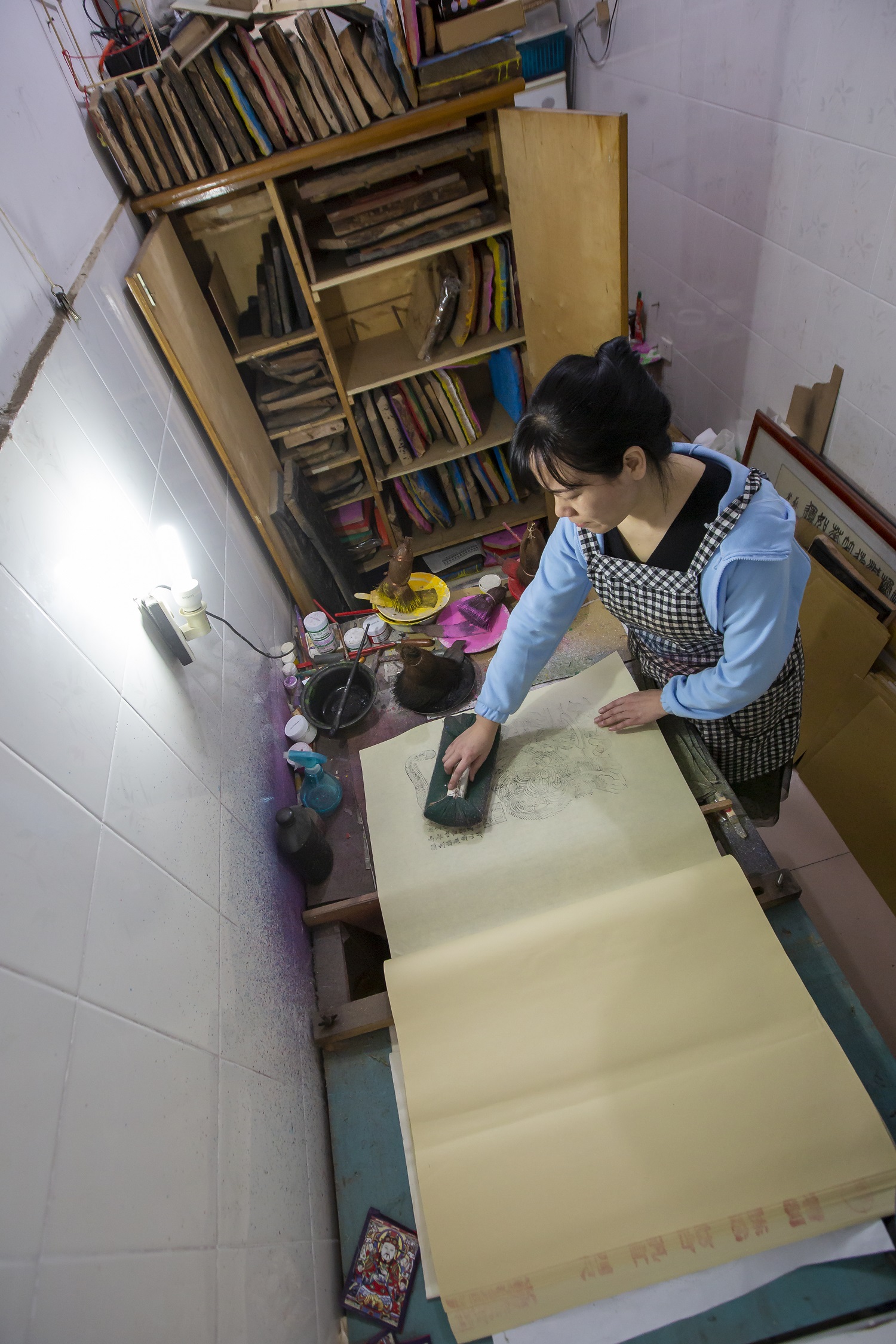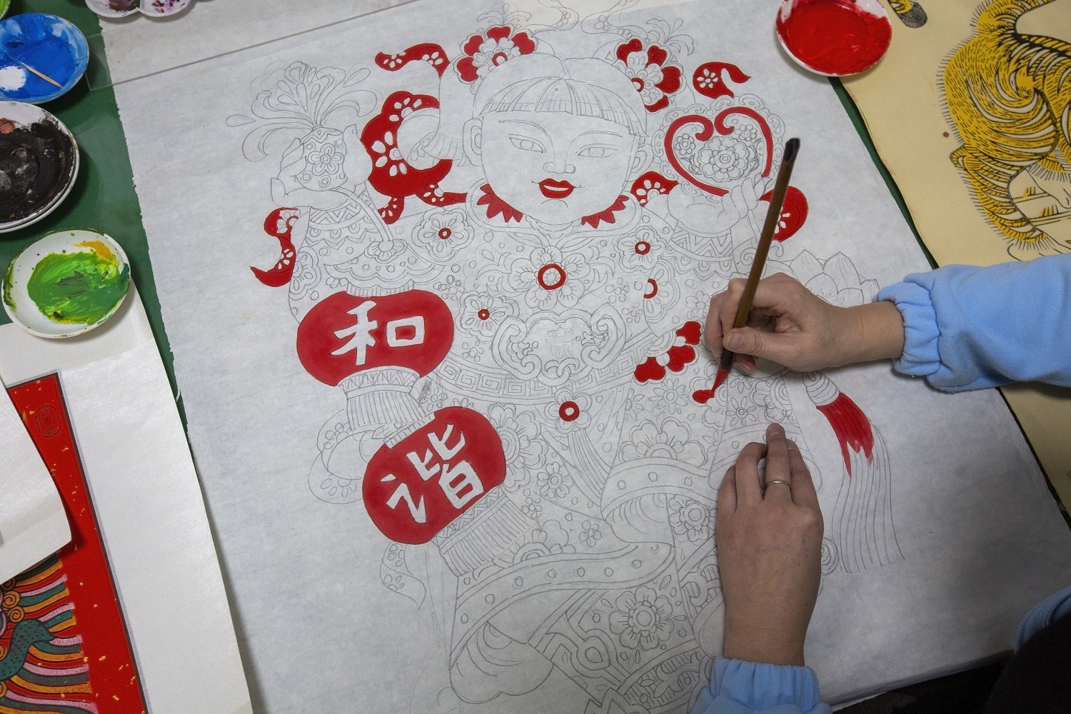 今年48岁的辛艳君,自小喜欢画画,2000年毕业于衡水职业技术学院习三内画艺术专业。一次偶然机会,辛艳君认识了武强一家年画作坊的负责人,得知作坊需要画师,痴迷于艺术的辛艳君毫不犹豫地进入作坊,从此与木版年画结缘。