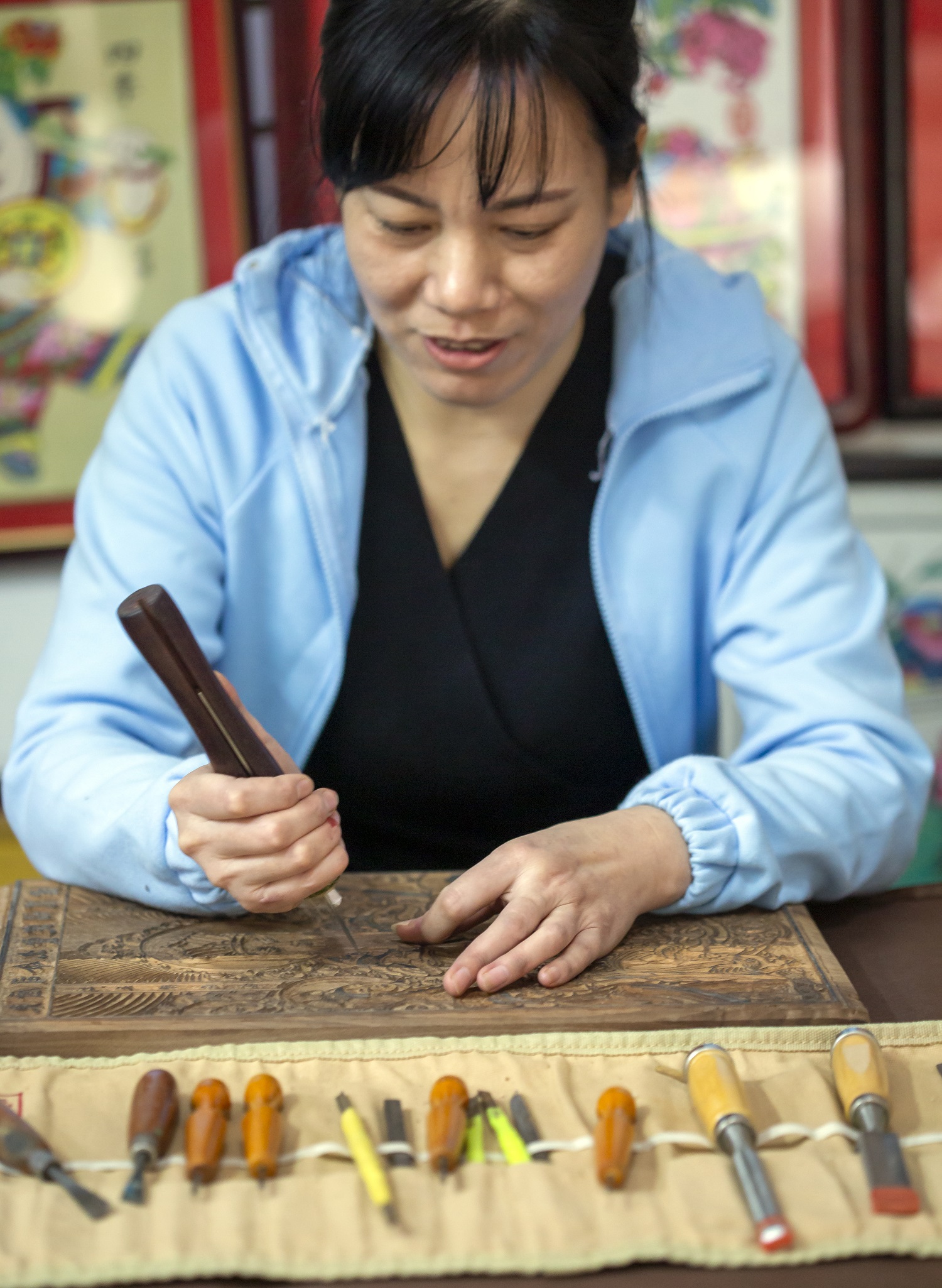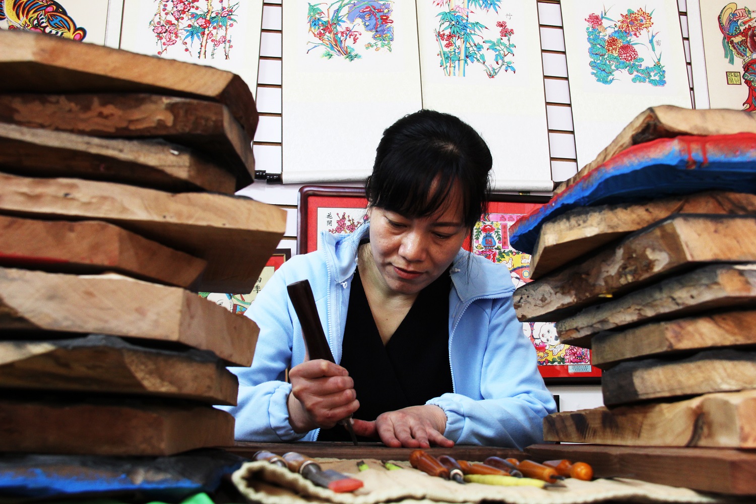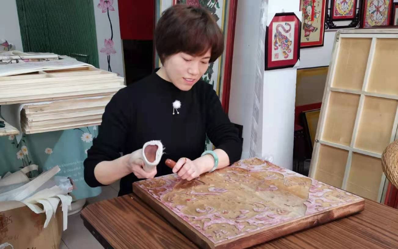 2006年,辛艳君开了一家淘宝店,专卖武强木版年画,随着生意越来越红火,客户的需求也开始多样化。“有人专门要刻版,因为货源紧张,我决定自己学。”她找到了武强年画国家级非遗传承人马习钦,一心学习刻版技艺。为了寻找合适的刻版木材,她三番五次驱车前往沧州,从当地农户手里收购木头。刻刀不离手的日子里,辛艳君手上不知磨了多少水泡,时间久了,水泡又变成厚厚的老茧。