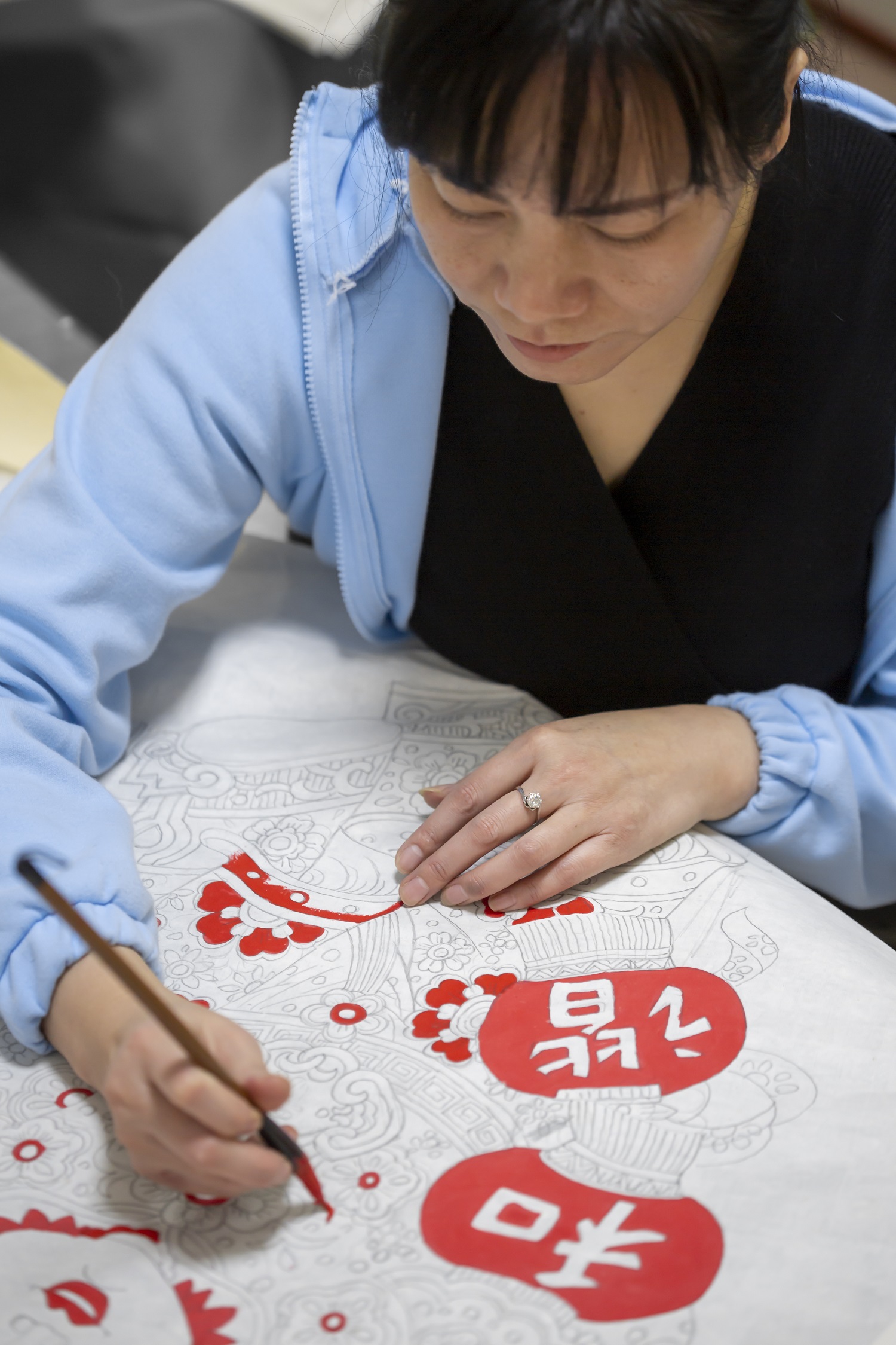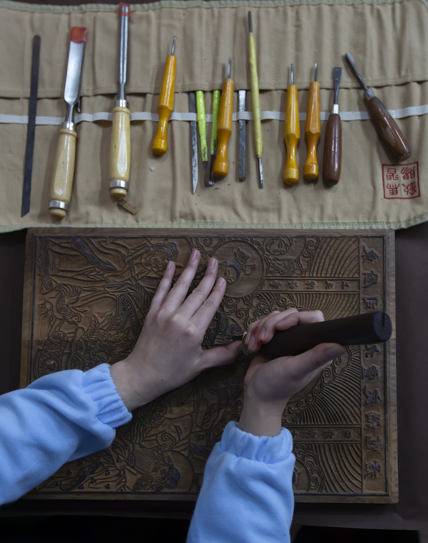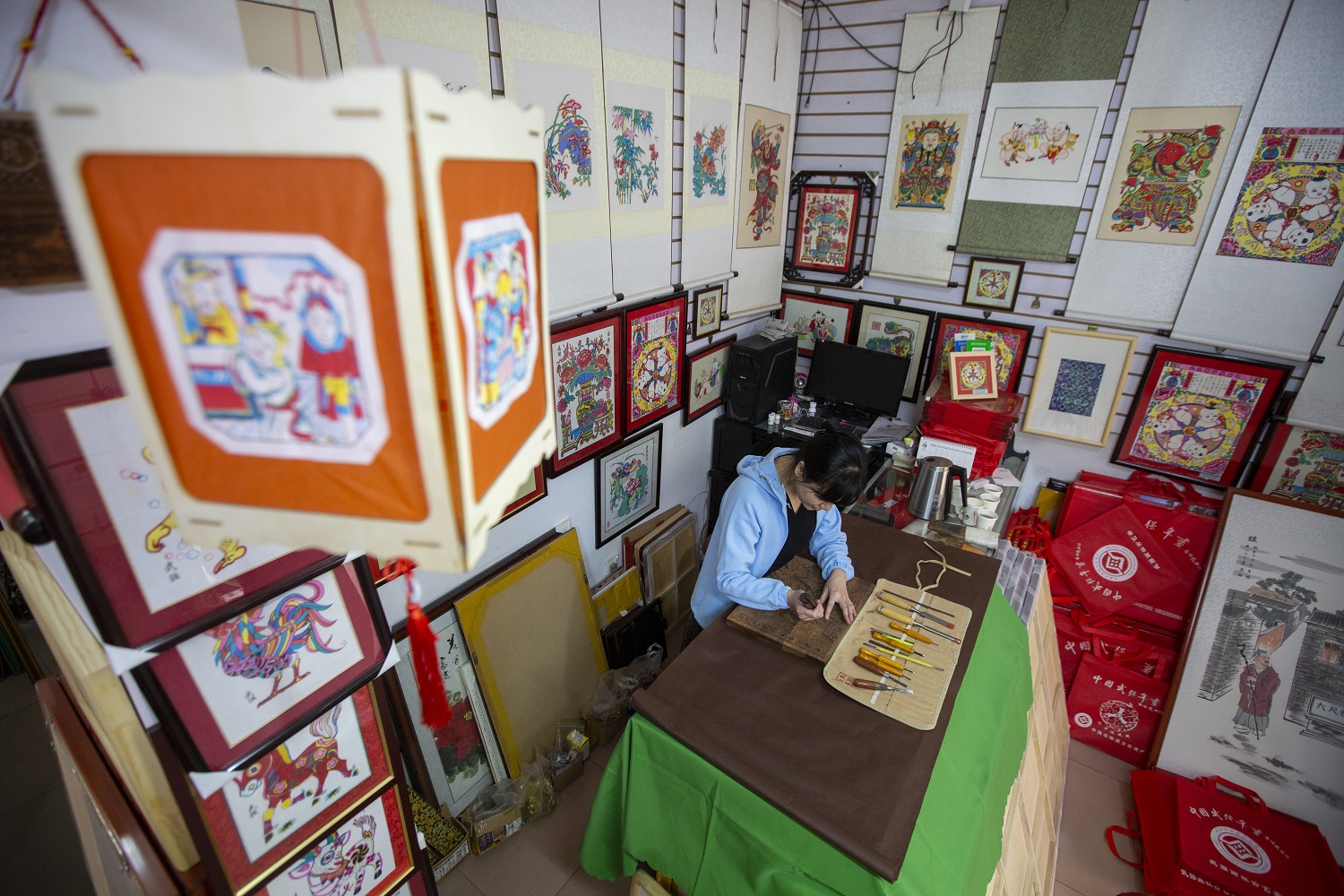 2006年,辛艳君开了一家淘宝店,专卖武强木版年画,随着生意越来越红火,客户的需求也开始多样化。“有人专门要刻版,因为货源紧张,我决定自己学。”她找到了武强年画国家级非遗传承人马习钦,一心学习刻版技艺。为了寻找合适的刻版木材,她三番五次驱车前往沧州,从当地农户手里收购木头。刻刀不离手的日子里,辛艳君手上不知磨了多少水泡,时间久了,水泡又变成厚厚的老茧。