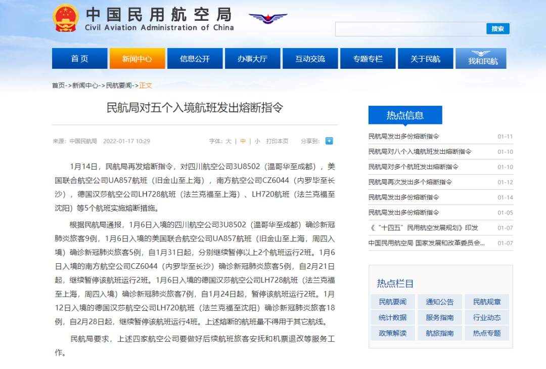 1月14日,民航局再发熔断指令,对四川航空公司3U8502(温哥华至成都),美国联合航空公司UA857航班(旧金山至上海),南方航空公司CZ6044(内罗毕至长沙),德国汉莎航空公司LH728航班(法兰克福至上海)、LH720航班(法兰克福至沈阳)等5个航班实施熔断措施。