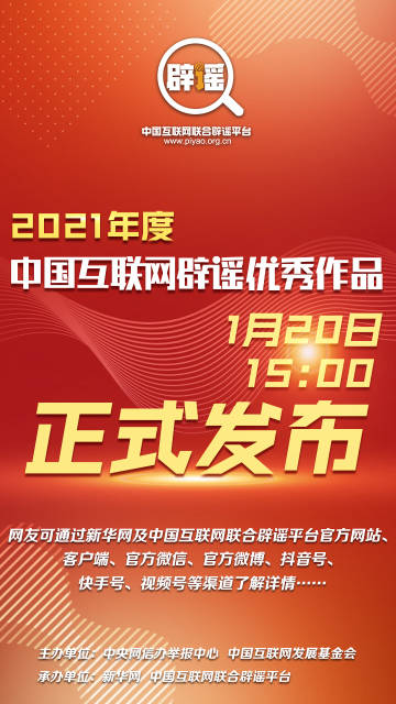 导语:#2021年度中国互联网辟谣优秀作品评选发布#将于1月20日揭晓,分为政治经济类、社会文化类、科普知识类和组织策划类四个类别。该活动旨在揭示谣言危害性,提高广大网民的识谣能力和媒介素养,推动形成全社会共同治理网络谣言的生动