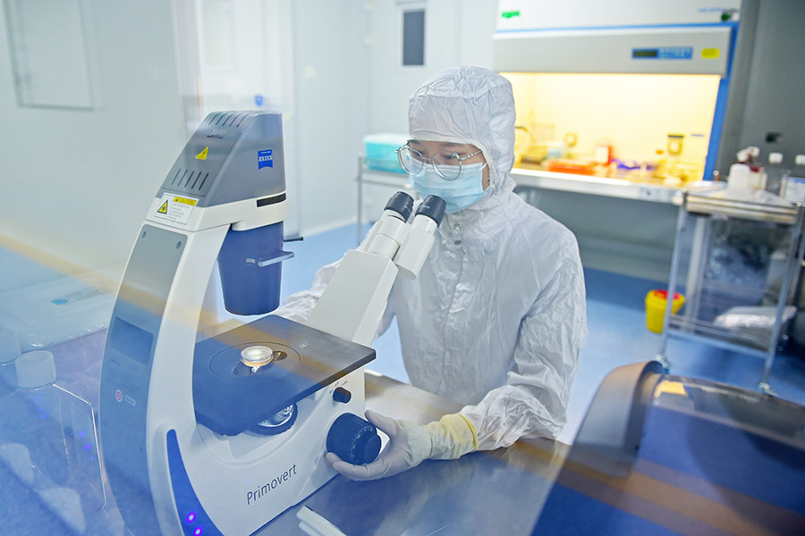 在保定·中关村创新中心,河北三臧生物科技有限公司工作人员在观察细胞生长情况(2021年8月20日摄)。新华社记者 朱旭东摄