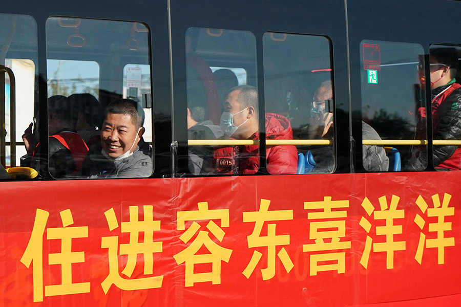 2021年10月19日,雄安新区容东片区首批安置住房分配工作启动,参加摇号的群众乘坐大巴车进入摇号工作现场。新华社记者 牟宇摄