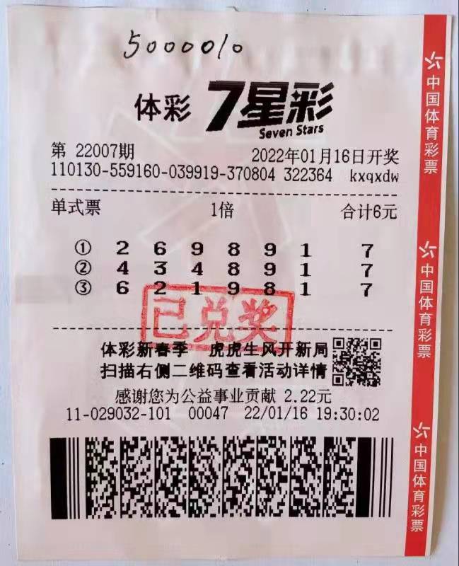 2022年伊始,衡水购彩者好运连连。1月16日晚,中国体育彩票7星彩游戏第22007期开奖,中奖号码为:6219817。当期,全国共开出3注一等奖,每注奖金500万元,其中1注一等奖花落衡水市冀州区冀新路发改局东邻的1311029032101号代销网点。