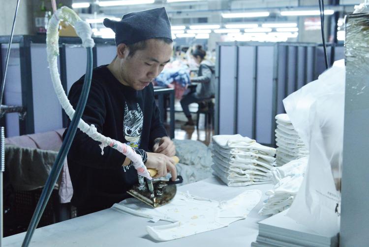 裁剪台上,布料叠放得整整齐齐,一名师傅正在划分区块以备接下来的裁剪。后道工作区域里,几位工人也忙不停地做着最后几道工序,正在有条不紊地质检、熨烫、包装、入库,赶制一批即将发往外地的童装订单……
