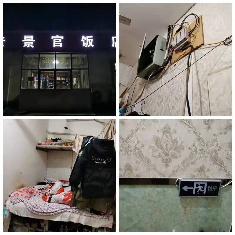 存在的主要隐患为:大厅部分线路、人员住宿房间的线路敷设不符合标准,未穿管保护;油烟道未定期清理;饭店内设置人员住宿房间;饭店内一处疏散指示标志未保持完好有效(情节轻微)。
