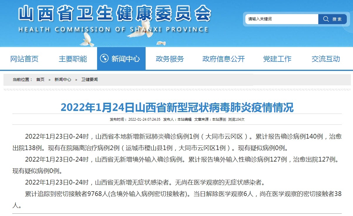 2022年1月23日0-24时,山西省本地新增新冠肺炎确诊病例1例(大同市云冈区)。累计报告确诊病例140例,治愈出院138例。现有在院隔离治疗病例2例(运城市稷山县1例,大同市云冈区1例)。现有疑似病例0例。