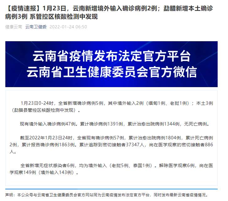 截至1月23日24时,云南省现有确诊病例57例,累计治愈出院病例1804例,累计死亡病例2例,累计报告确诊病例1863例。累计追踪到密切接触者37347人,尚在医学观察的密切接触者886人。