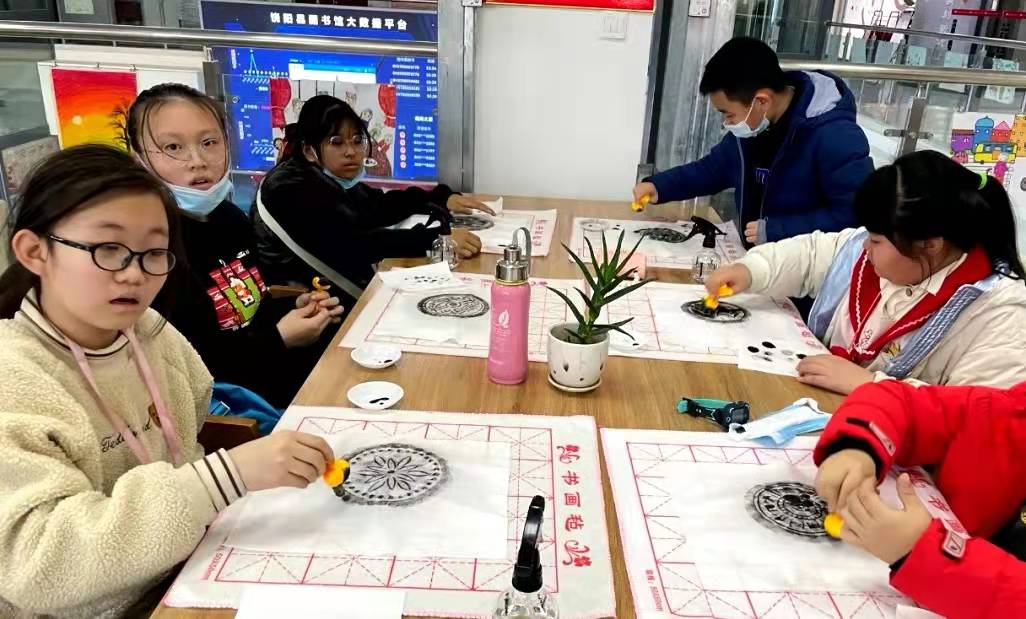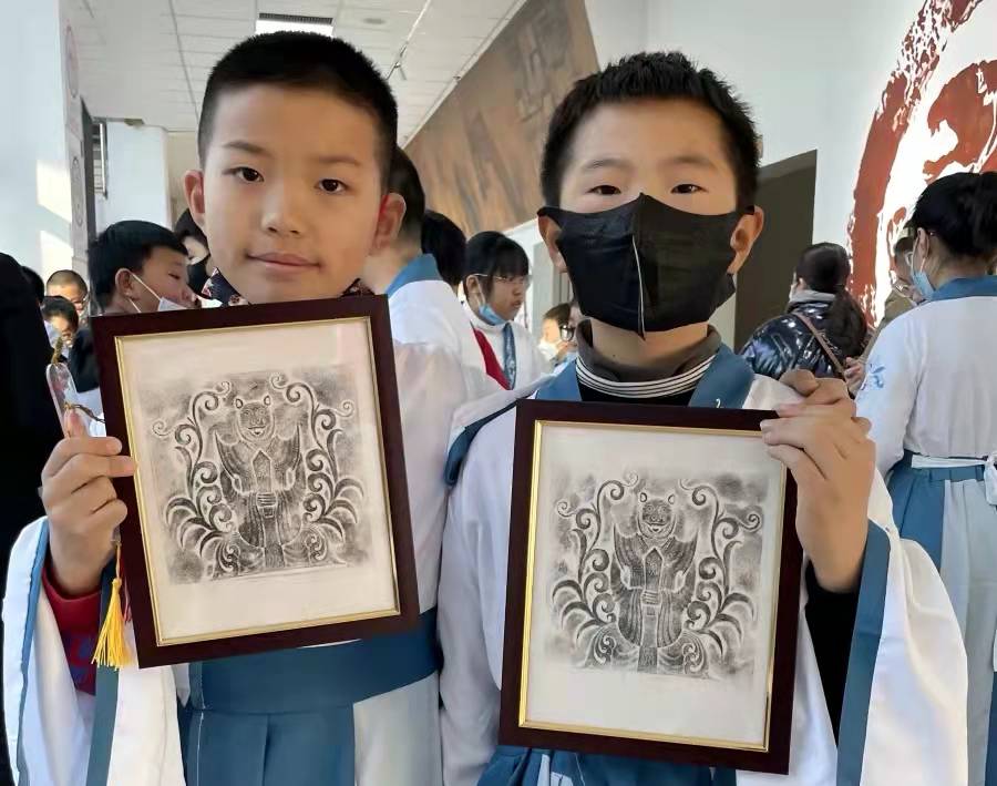 拓片是我国一项古老的传统技艺,学生们使用宣纸和墨汁,将瓦当上的图文清晰地拷贝出来。他们诵读诗经,体验和感受《诗经》的魅力,提升对中国传统文化的理解与热爱。