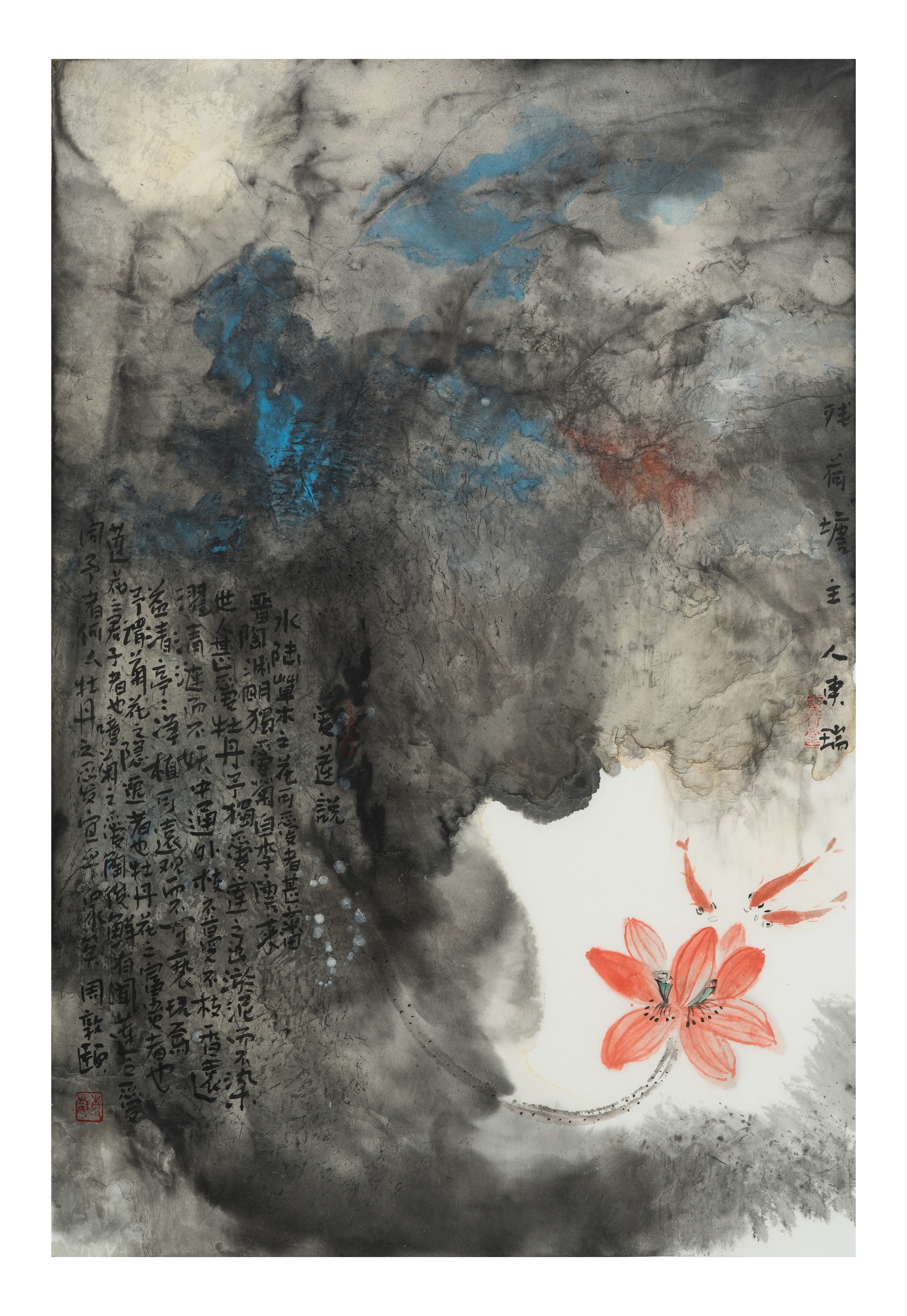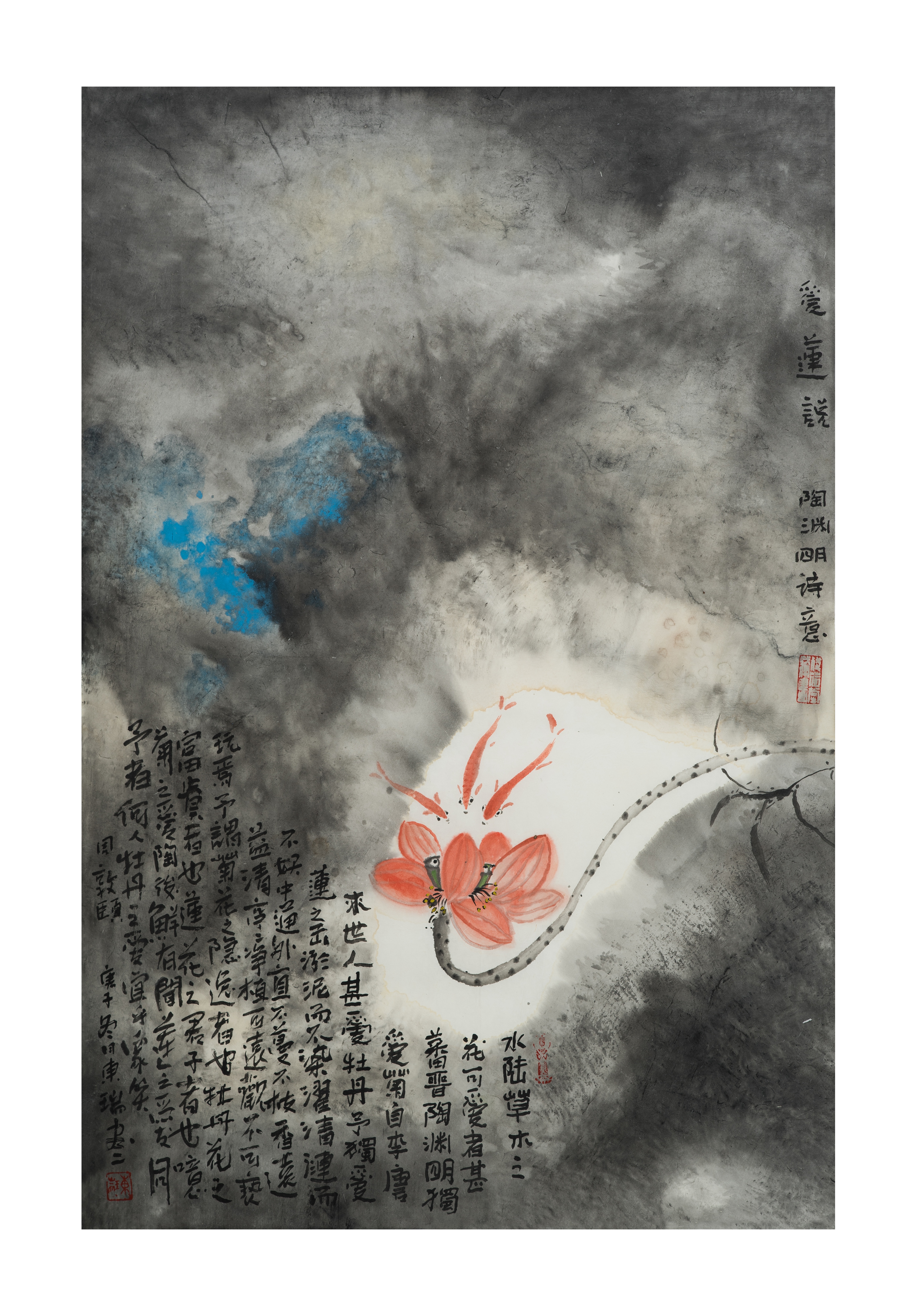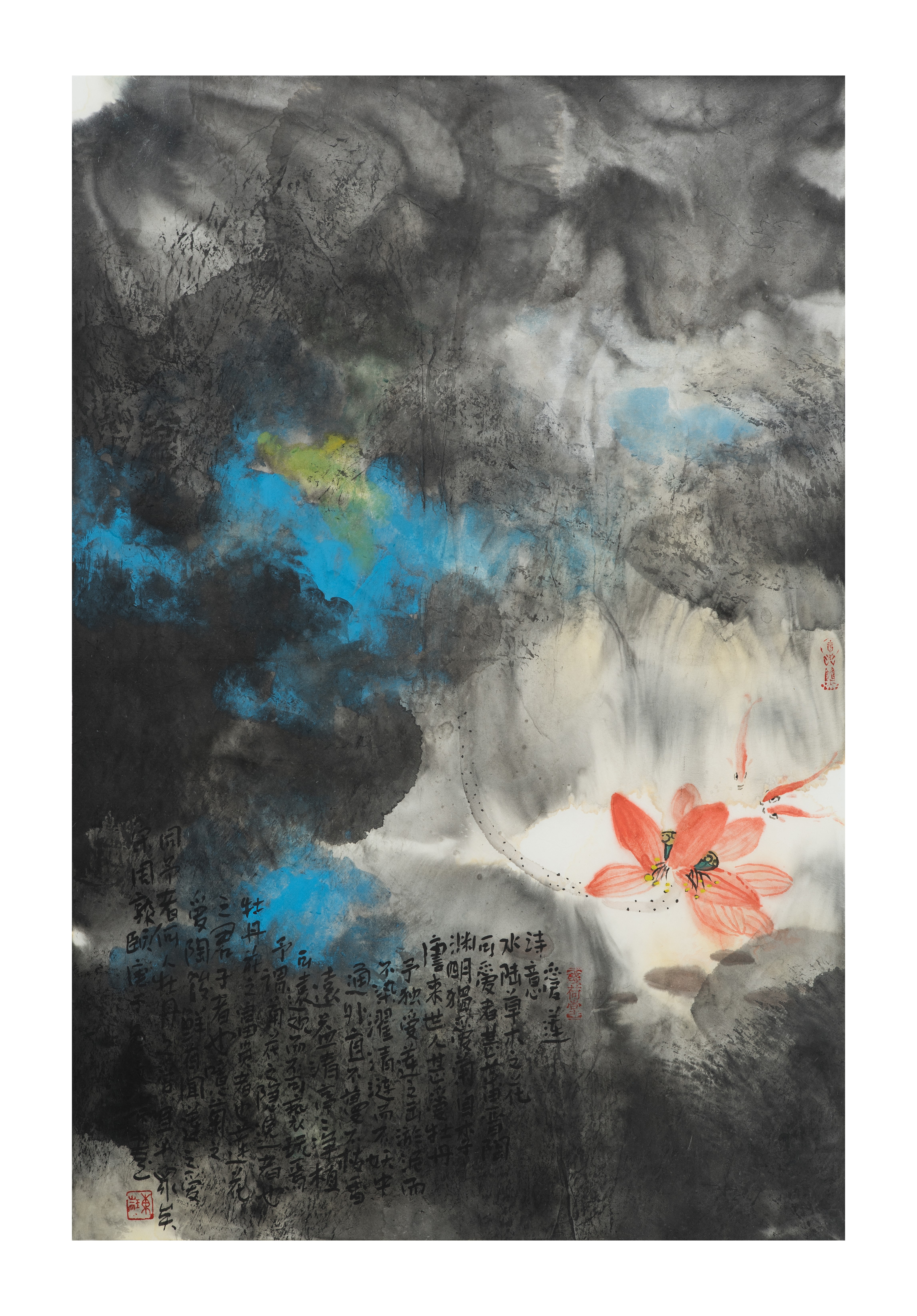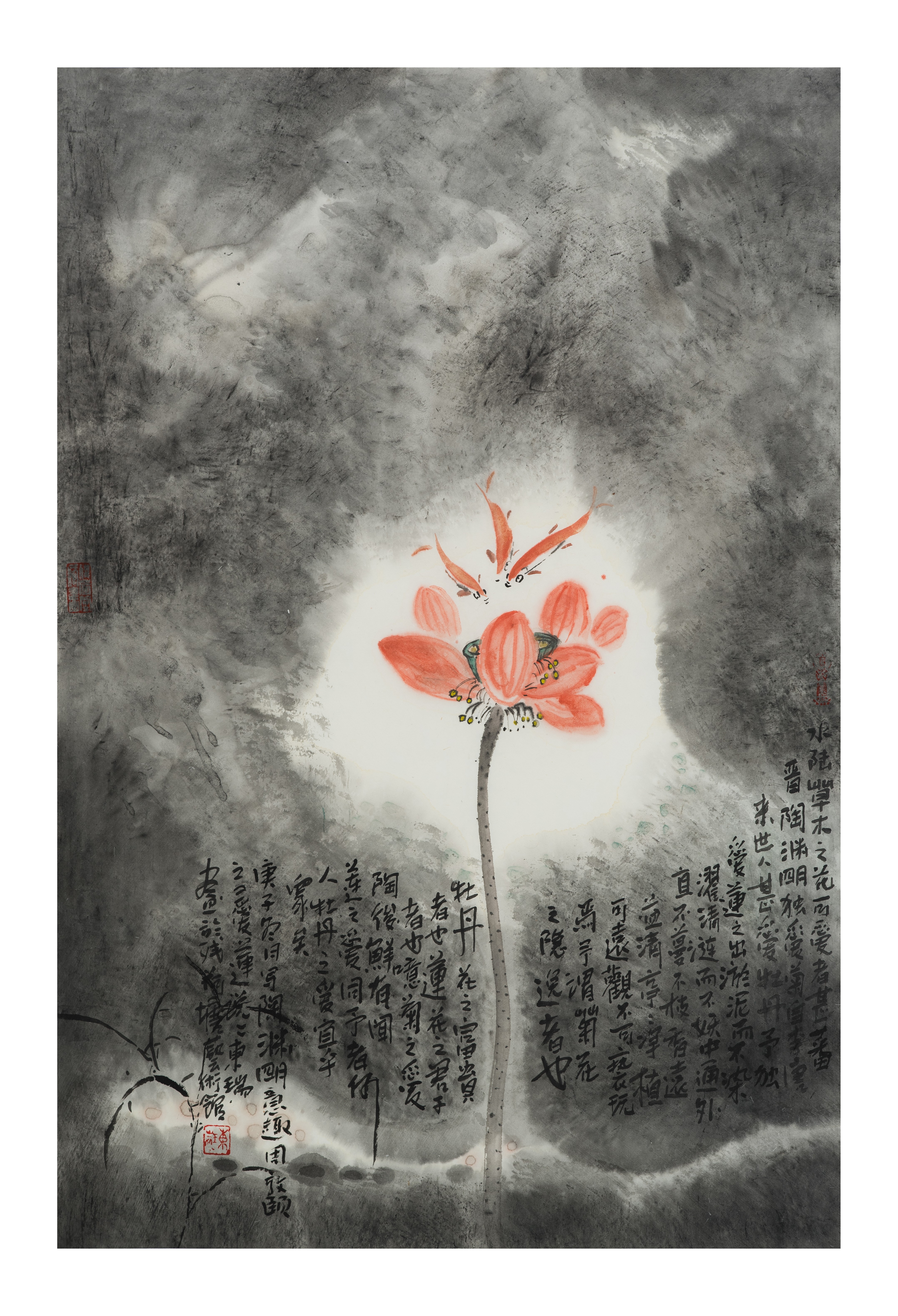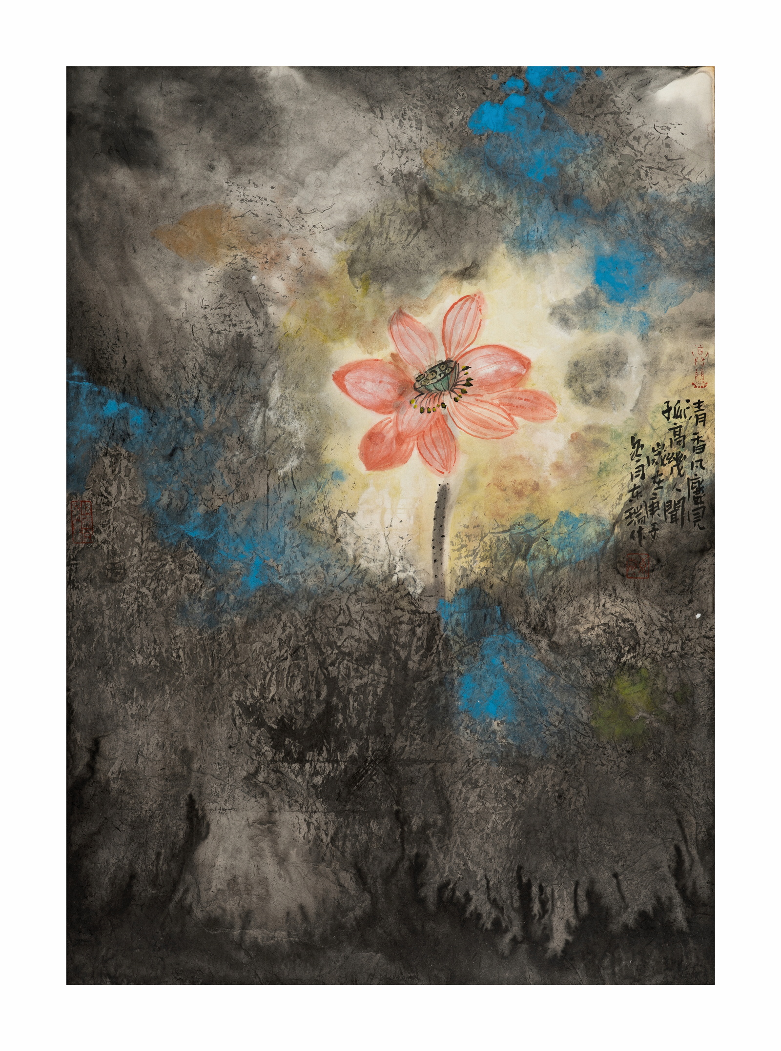 画家在花鸟作品中融入山水的画法,在点线之间融入光影留白,让莲花有了神性,这种自由的表达直指画者心性,是谓“出尘”。