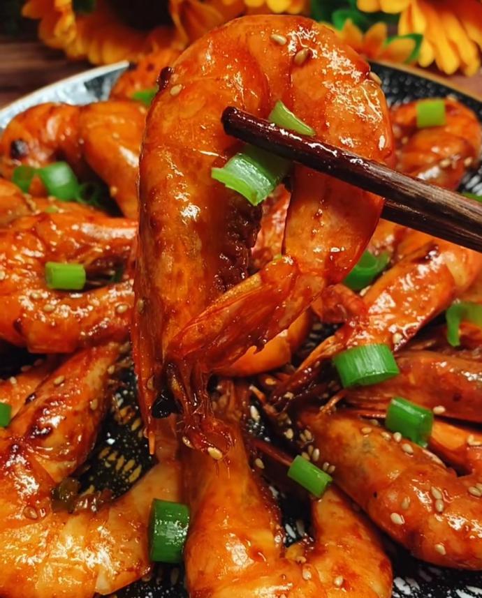 大虾、姜、葱、生抽、料酒、番茄酱、白糖、盐、白芝麻