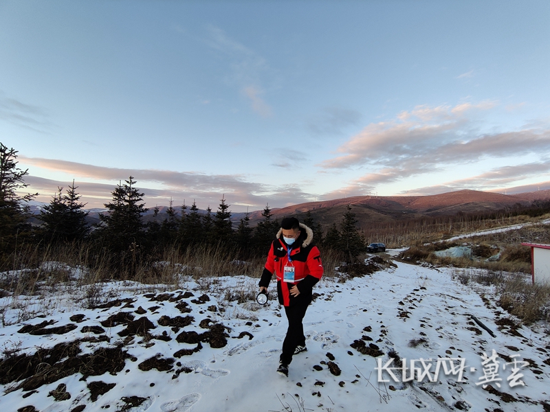 山路崎岖难行,海拔1770米的国家越野滑雪中心北侧山顶,寒风凛冽,走不了几步,脚就冻僵了。巡检团队到达山顶时,已接近黄昏,从山顶俯瞰整个古杨树场馆群,蜿蜒的雪道犹如银龙,远处的雪如意在夕阳下熠熠生辉,身后的明长城遗址也已点亮,绽放出璀璨光芒,十分壮观。