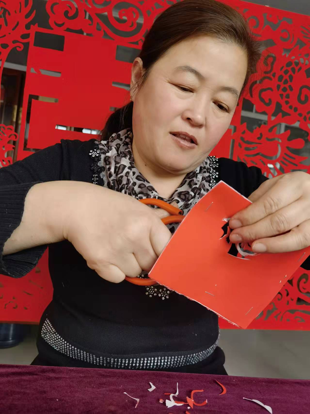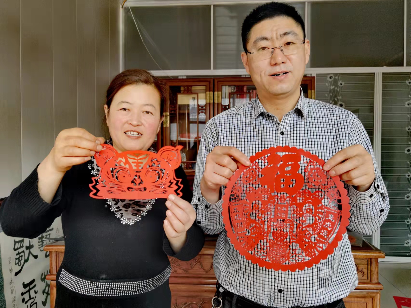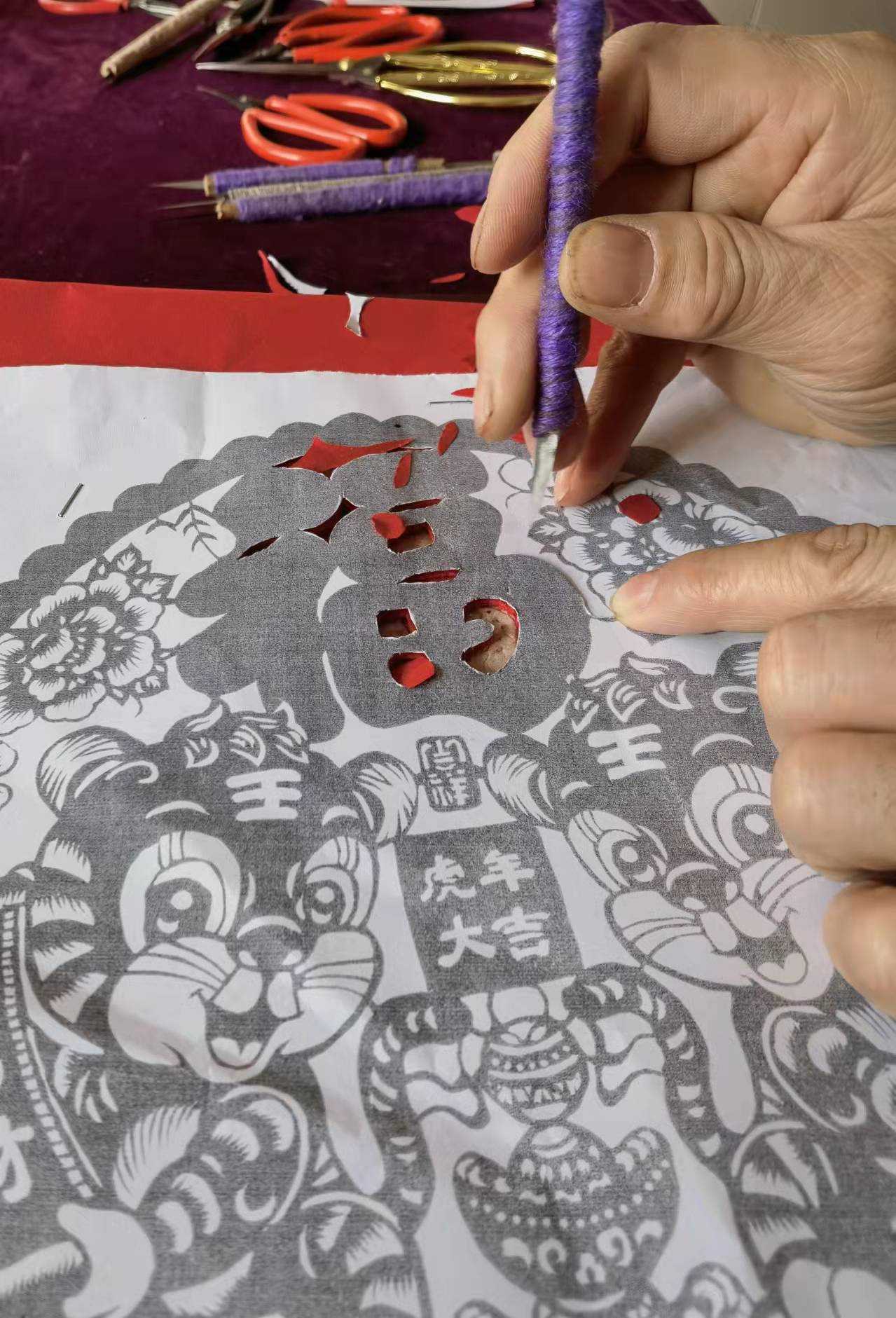当日上午10时许,夫妻俩将红纸、刻刀、剪刀等摆放好,立刻埋头开始创作。只见俩人摆动着灵巧的双手,刻刀、剪刀宛如游龙,翻翻转转间,一张张精致的剪纸作品就跃然纸上了。“虎年剪只虎,象征着一鼓作气、勇猛奋斗、运势浩盛,寓意虎年富贵吉祥。”两人边说边将剪好的作品贴在窗户上,红红的窗花一下子就将过年的喜庆气氛烘托出来了。除了虎元素剪纸作品外,夫妻俩当日还制作了“五福临门”“喜上眉梢”等传统作品。