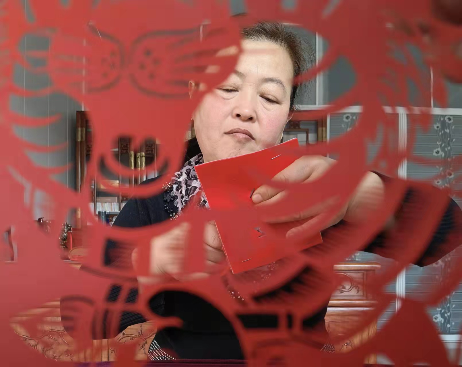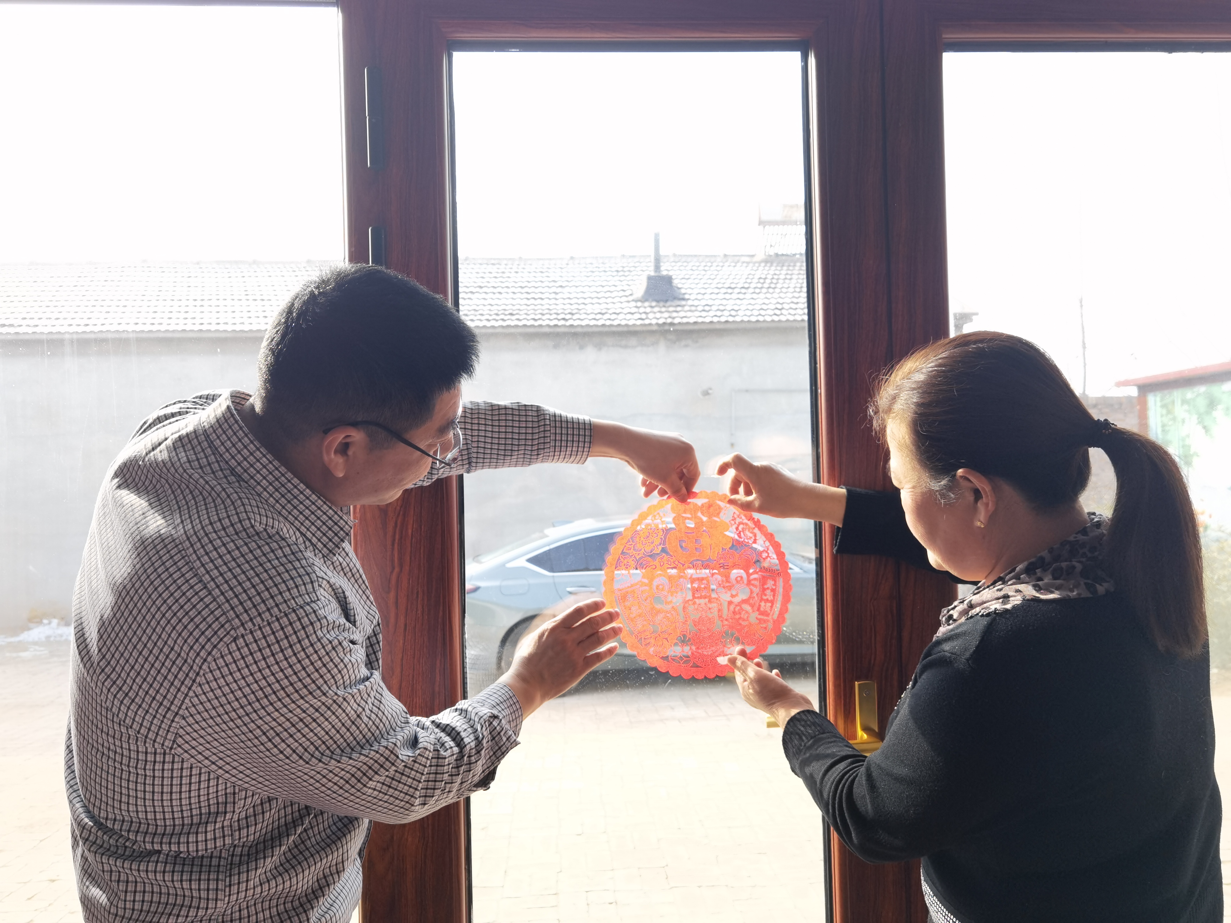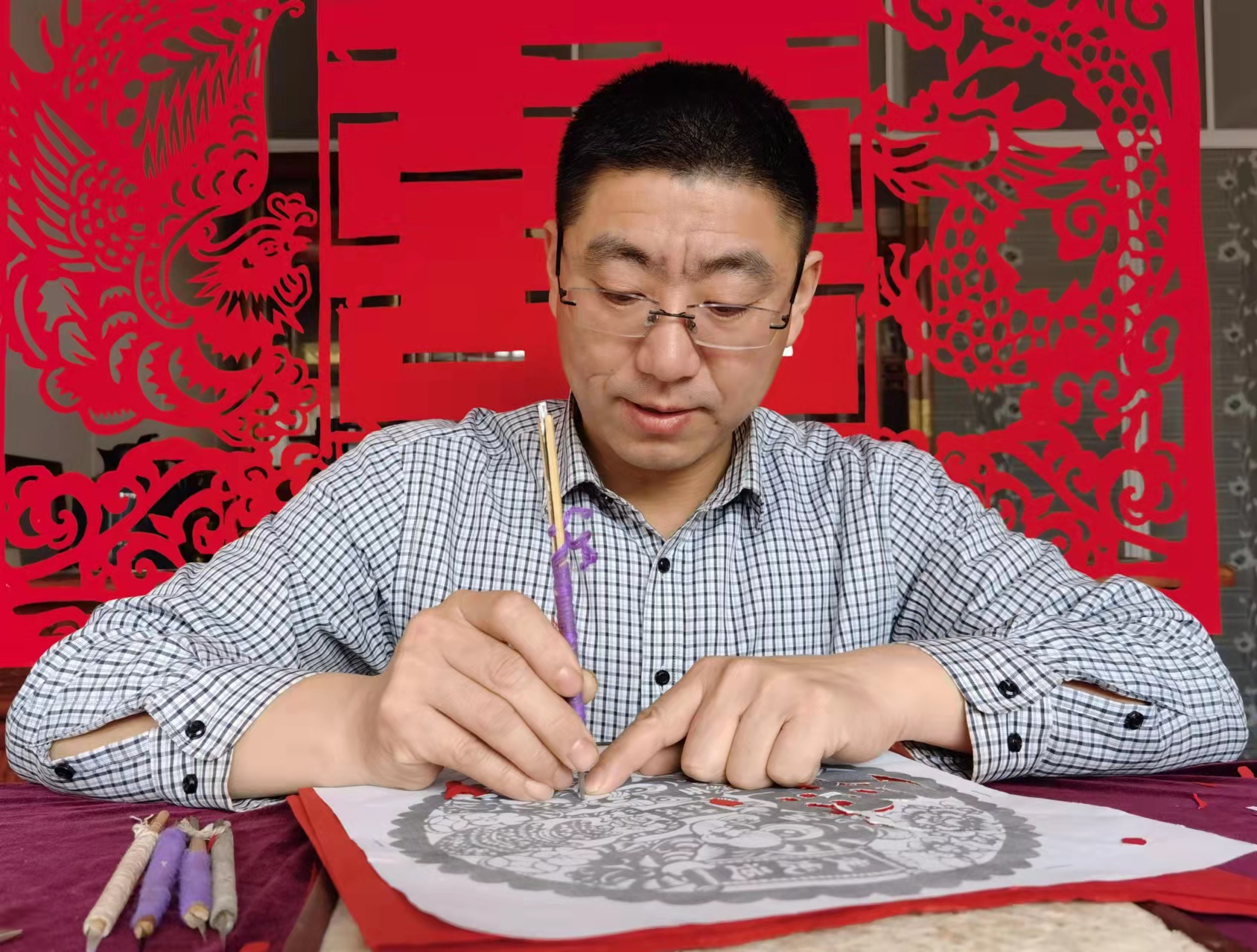 当日上午10时许,夫妻俩将红纸、刻刀、剪刀等摆放好,立刻埋头开始创作。只见俩人摆动着灵巧的双手,刻刀、剪刀宛如游龙,翻翻转转间,一张张精致的剪纸作品就跃然纸上了。“虎年剪只虎,象征着一鼓作气、勇猛奋斗、运势浩盛,寓意虎年富贵吉祥。”两人边说边将剪好的作品贴在窗户上,红红的窗花一下子就将过年的喜庆气氛烘托出来了。除了虎元素剪纸作品外,夫妻俩当日还制作了“五福临门”“喜上眉梢”等传统作品。