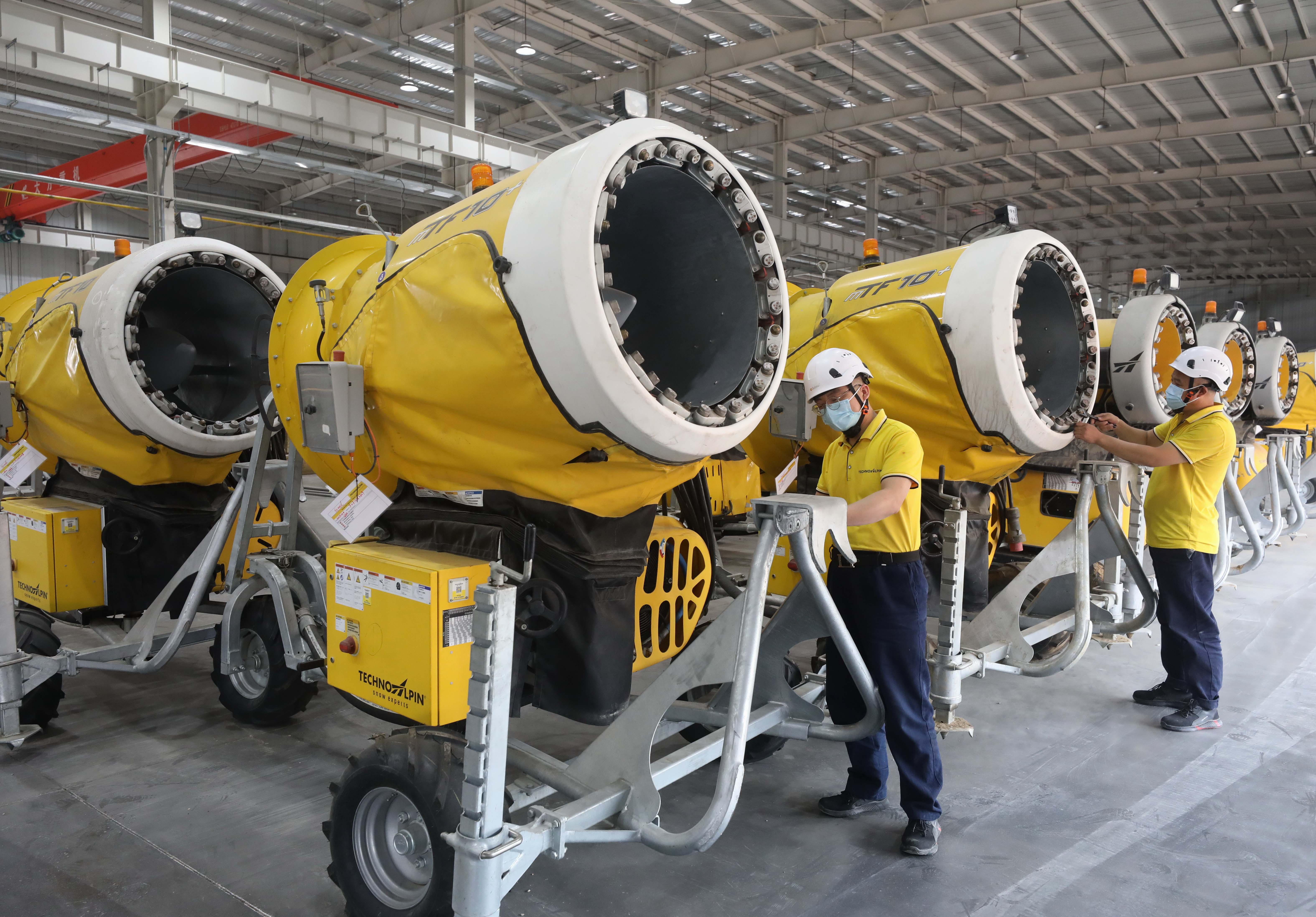 张家口高新区冰雪运动装备产业园内,一家冰雪设备企业的工人在车间查验造雪机质量。