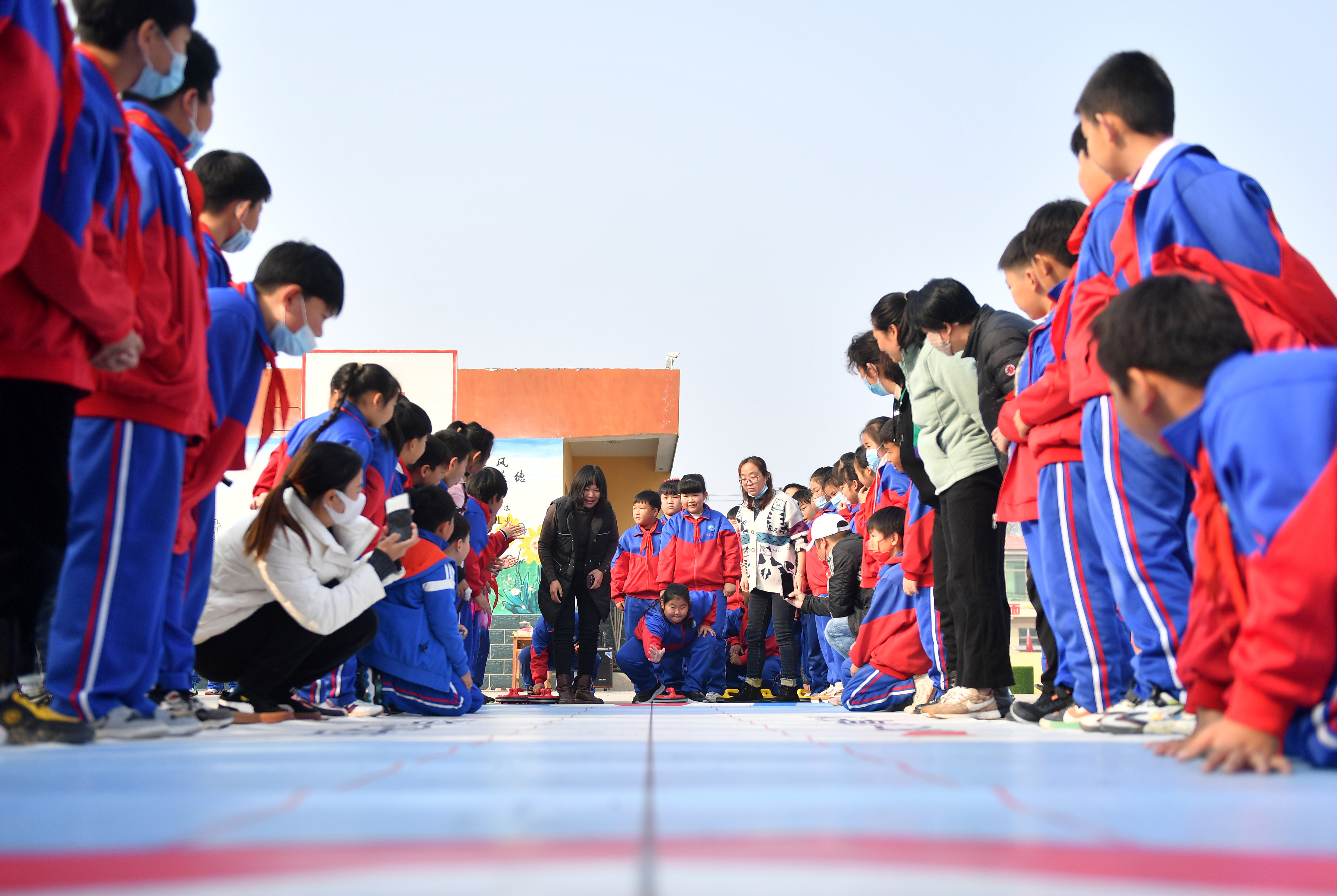 河北雄安新区“冰雪大篷车”走进安新县杨庄子小学,陆地冰壶、桌上冰壶、陆地冰球等运动让学生体验到了冰雪运动的乐趣。学生体验陆地冰壶运动。 中新社记者 韩冰 摄