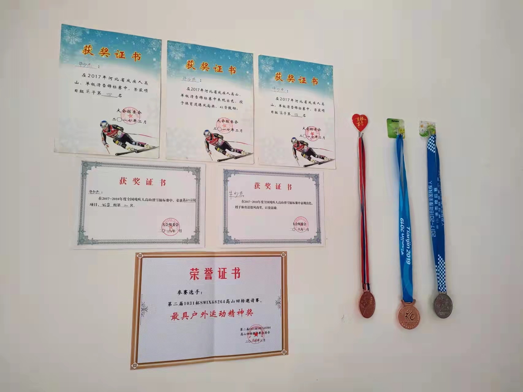 在牛少杰家,记者看到墙上贴着一些成为运动员后他所获得的荣誉。从这荣誉可以看出,这几年,对于牛少杰而言可谓收获满满。2017年,在河北省残疾人高山、单板滑雪锦标赛中荣获项目组男子第四名;在2017—2018年度全国残疾人高山滑雪锦标赛中荣获男子大回转项目站姿组第二名;2019年,在全国第十届残疾人运动会中荣获高山滑雪大回转第三名……“因为热爱,加之教练的悉心培养,孩子取得了这些成绩。”牛少杰的母亲白淑芬指着墙上的这些荣誉感慨地说,冰雪项目经常在室外训练,环境艰苦,孩子摔跤受伤,手脚有冻伤是常有的事。“每一项荣誉都来之不易,是孩子用汗水和泪水换来的,这些年受的苦,他从没主动跟我们说过,怕我们担心,也怕我们心疼。”