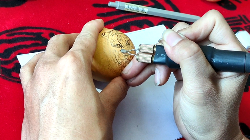 烙画的葫芦别看个头小,但工艺流程并不简单,从上千个葫芦样品中选定合适的葫芦之后,便要根据葫芦尺寸确立立意,设计画稿,仅用一支铁笔便将老虎“毛发毕现”绝不是一件容易的事。与其他葫芦烙画的方式不同,何胜旺的葫芦烙画里还经常出现自己的创作诗词。画与字交相呼应,能起到画龙点睛的作用。