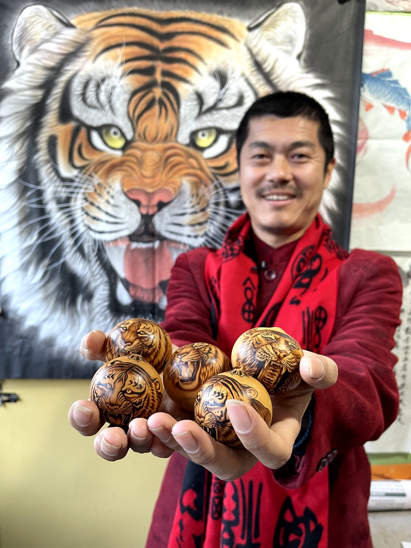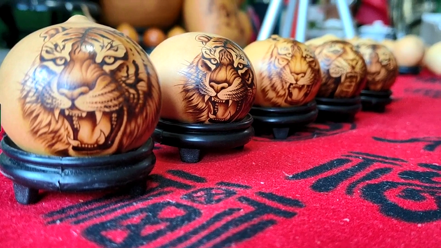 一支铁笔行天下,团圆吉祥寓意深。何胜旺的工作室并不算大,弥漫着一股葫芦烙画特有的香味,虽然摆满了大大小小不一的葫芦作品和创意字画作品,但他正在制作虎年生肖款系列葫芦尤其吸引人。2022年是生肖虎年,虎在中国文化中非常独特,他通过烙画将吉祥的葫芦与威猛的老虎相结合,表达祝福之意。“在葫芦上画老虎,葫芦是我们说的有‘福’有‘禄’,虎和福也是谐音,这个作品就是‘福上加福’。 ”