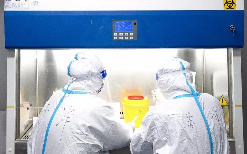 县医院核酸检测实验内每天面对海量的标本,党员干部带头进入最危险的检测区,进行核酸标本检测。作为距离病毒最近的人,何永正、刘洪敏每天厚重的防护装备和长时间高强度工作,对体力和耐力都是极大的挑战。每次实验结束,汗水都湿透了衣衫,手部关节疼痛,手指红肿。