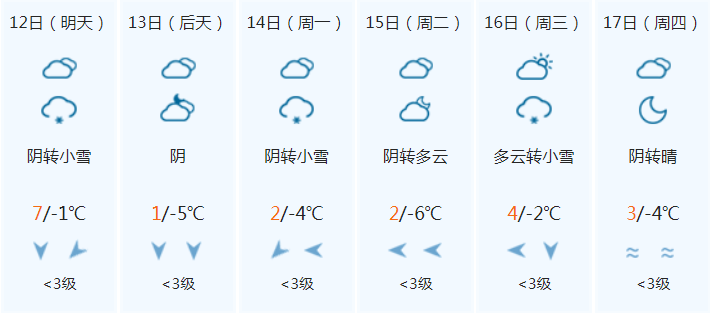 具体天气预报为:2月11日,多云,气温:8到-2℃;2月12日,多云转阴有小雪,北部中雪到大雪,气温:8到-1℃;2月13日,阴有小雪,气温:1到-5℃;2月14日,多云间晴,气温:1到-6℃;2月15日,多云,气温:2到-6℃;2月16日,多云转阴,气温:3到-4℃;2月17日,阴有小到中雪,气温:1到-2℃。