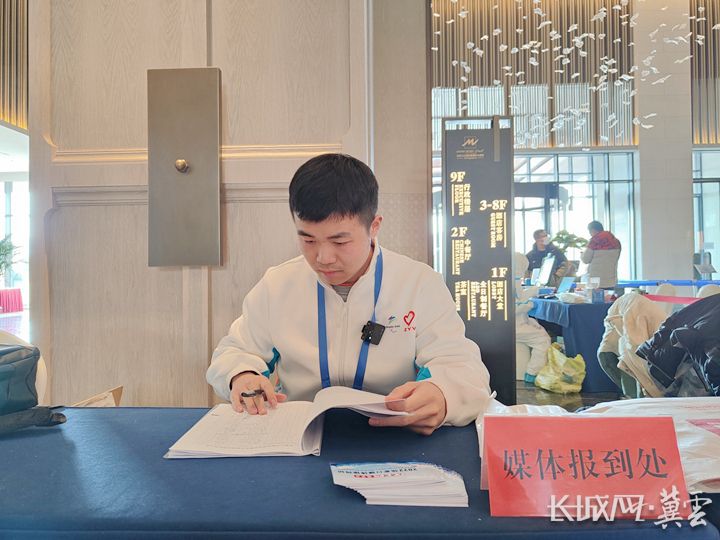 志愿者白一江在核对媒体记者登记信息。长城网·冀云客户端记者 代晴 摄