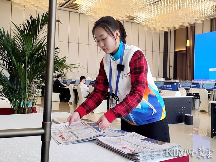 志愿者陈姝婕整理媒体公共工作区的资料。长城网·冀云客户端记者 闫航 摄
