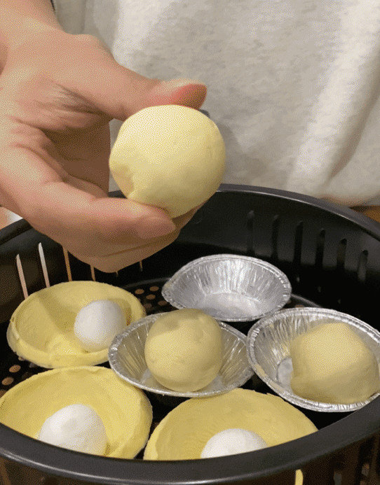 2、把汤圆放入蛋挞皮中,然后把蛋挞皮包裹起来,揉成一个圆形的球球,放回蛋挞皮的锡纸中,记得用牙签,在表面戳几个小孔,这样烤的时候不会爆裂。