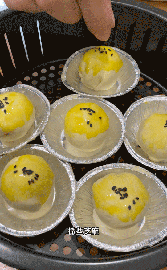 3、然后把鸡蛋搅散,接着在蛋挞皮上刷上一层蛋液,然后撒些黑芝麻。